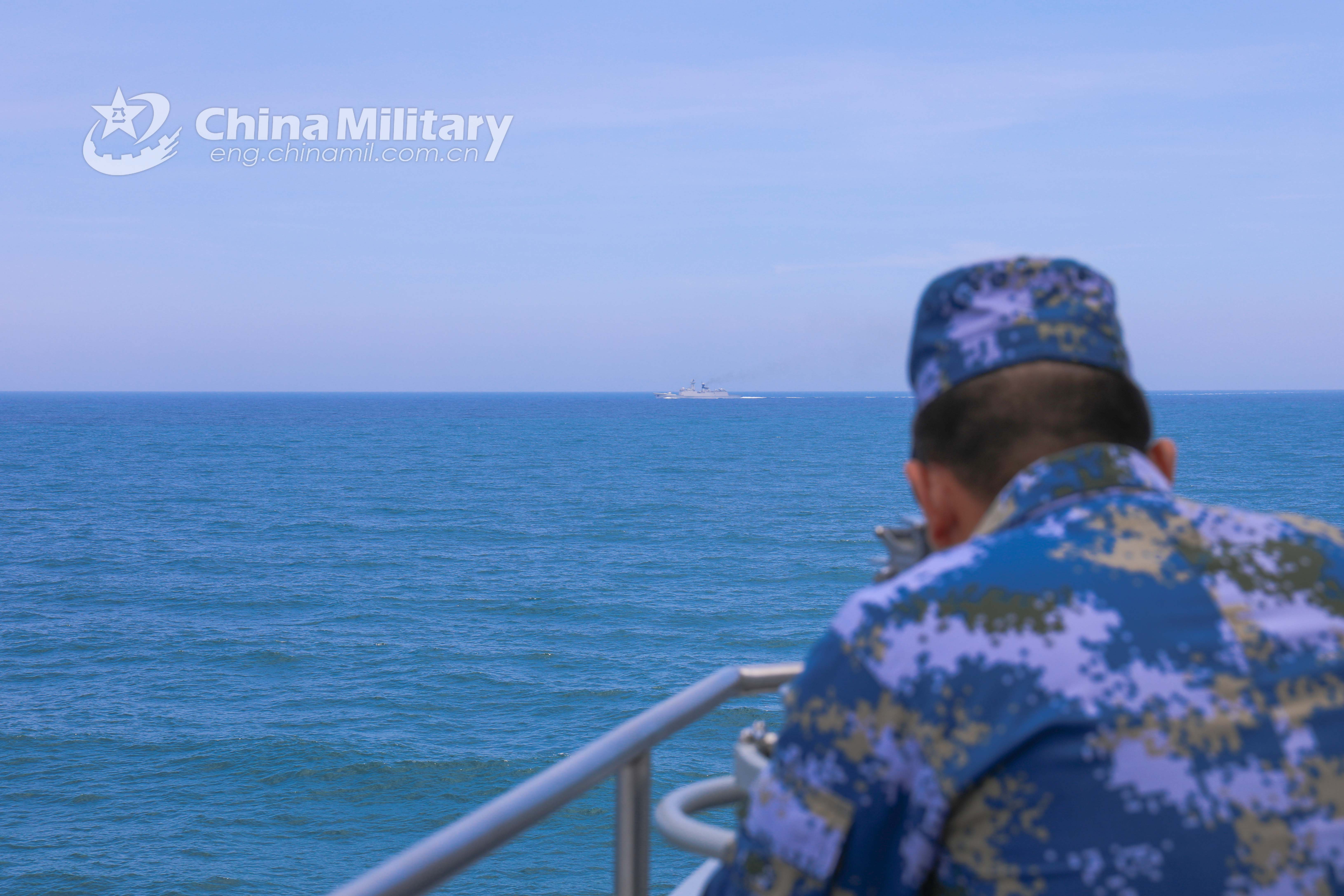 A signalman assigned to a destroyer flotilla with the navy under the PLA Southern Theater Command observes the target at a distance on deck during the real combat training in waters of the South China Sea on May 29, 2020. (eng.chinamil.com.cn/Photo by Chen Yubin)