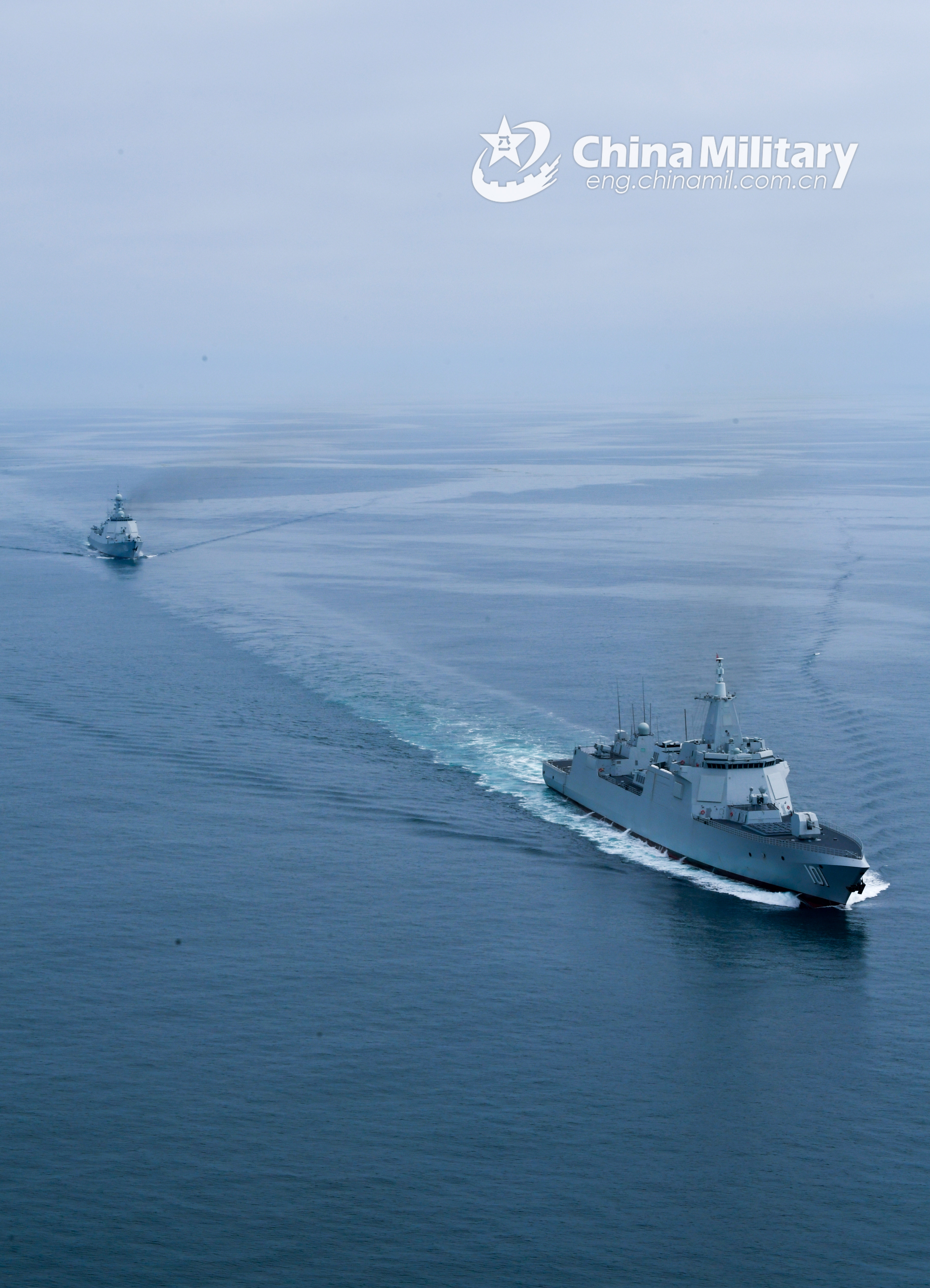 The guided-missile frigate Datong (Hulll 580, Rear) and the guided-missile destroyer Nanchang (Hull 101, Front) attached to a naval vessel training center under the PLA Northern Theater Command steam in tactical formation to occupy attack positions in an undisclosed sea area during a recent 10-day maritime training exercise. (eng.chinamil.com.cn/Photo by Zou Xiangmin)