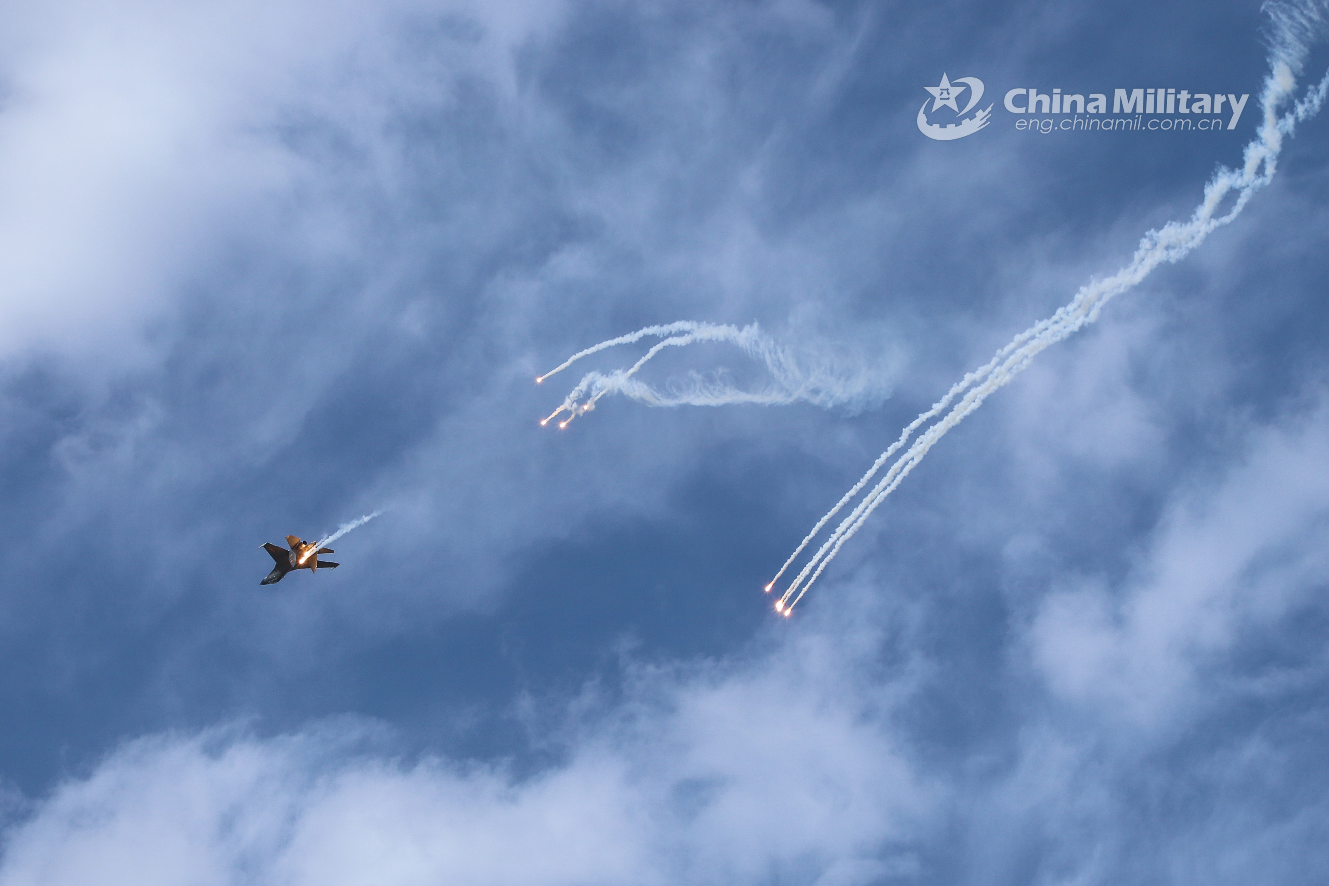 A fighter jet attached to an aviation brigade of the air force under the PLA Western Theater Command deploys jamming shells in avoiding the mock hostile missiles during a flight training task on September 5, 2020. (eng.chinamil.com.cn/Photo by Wen Rui)