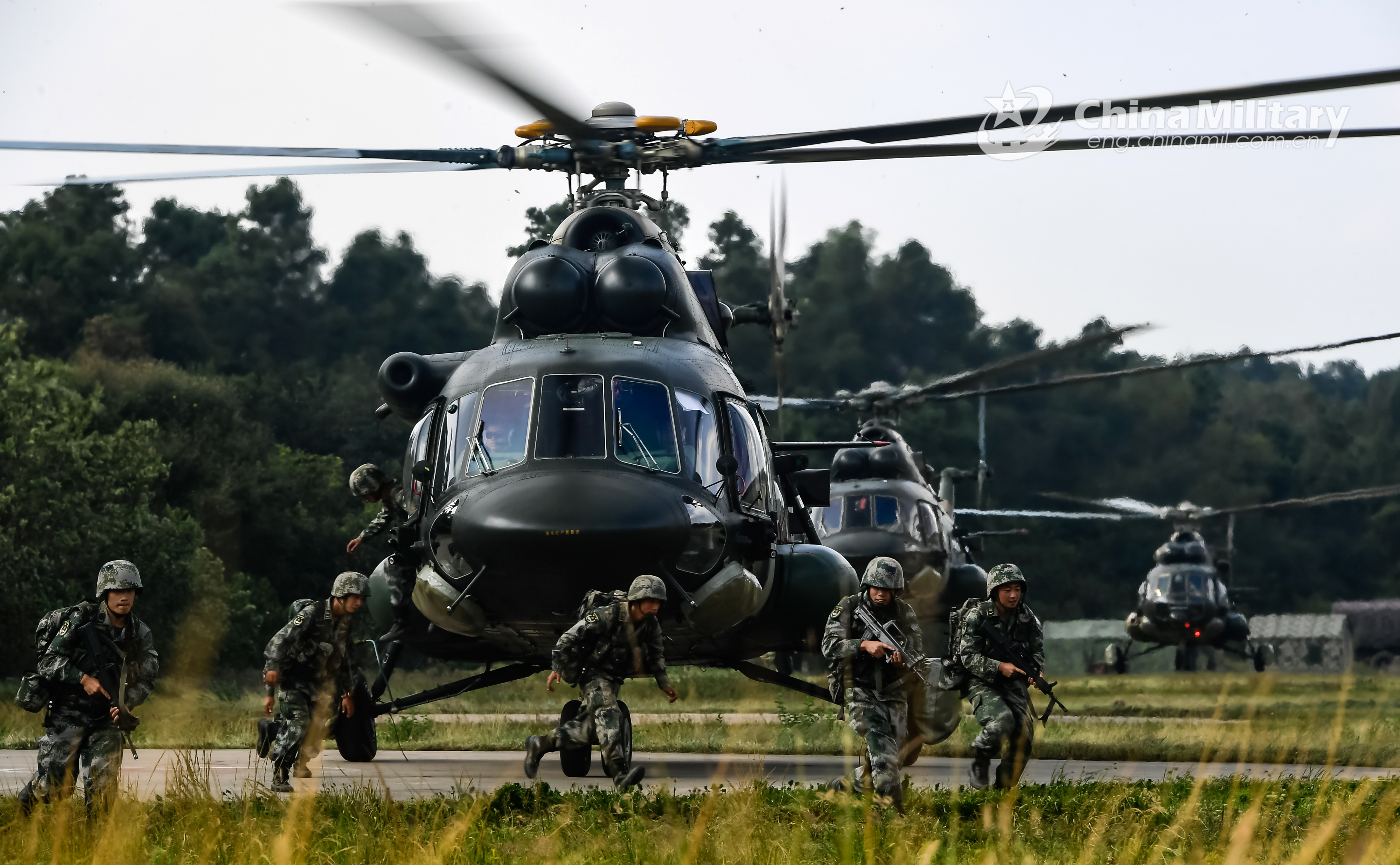Soldiers assigned to an army aviation brigade under the PLA 73rd Group Army rush to occupy positions after disembarking from a transport helicopter during a realistic training exercise on September 26, 2020. The army aviation brigade conducts training subjects including fast-roping, firepower support and force projection, aiming to hone the troops’ joint operations capabilities. (eng.chinamil.com.cn/Photo by Li Shilong)
