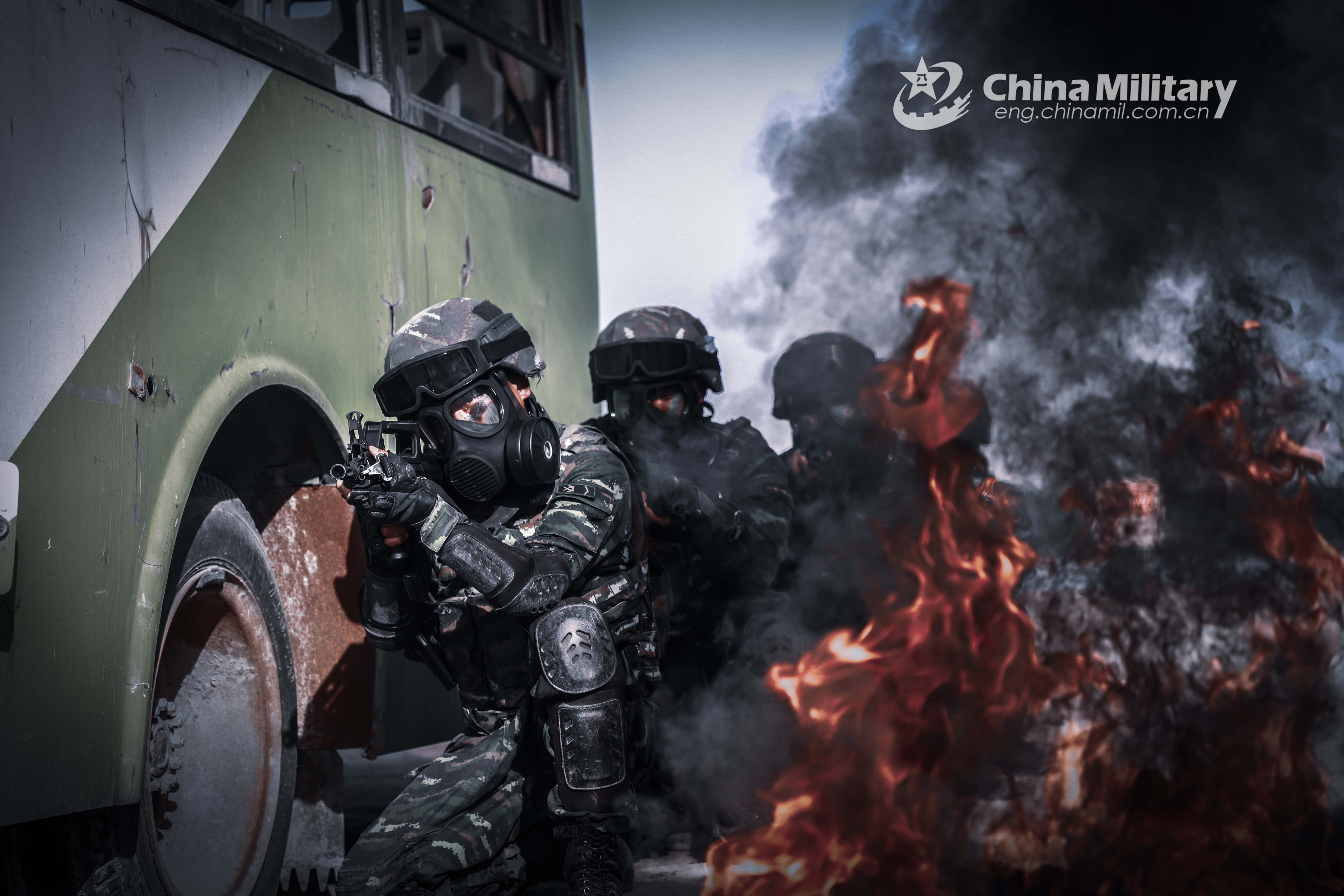 Special operations soldiers assigned to a mobile detachment of the Chinese People’s Armed Police (PAP) Force Xinjiang Contingent approach the target with aimed rifles during a recent counter-terrorism drill. (eng.chinamil.com.cn/Photo by Zhang Wen)