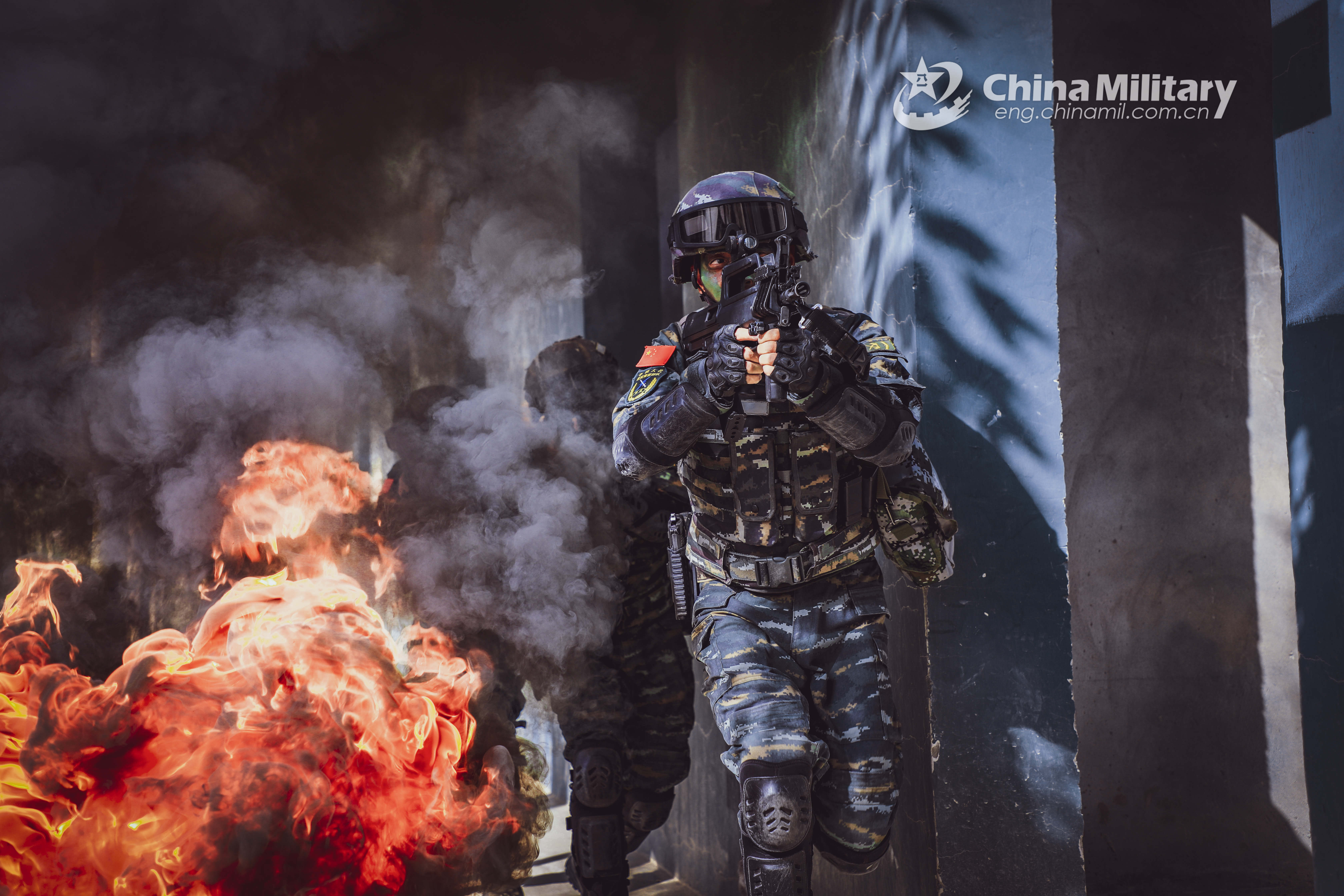 Special operations soldiers assigned to a mobile detachment of the Chinese People’s Armed Police (PAP) Force Xinjiang Contingent are going to breach into a shoot house during a recent counter-terrorism drill. (eng.chinamil.com.cn/Photo by Zhang Wen)