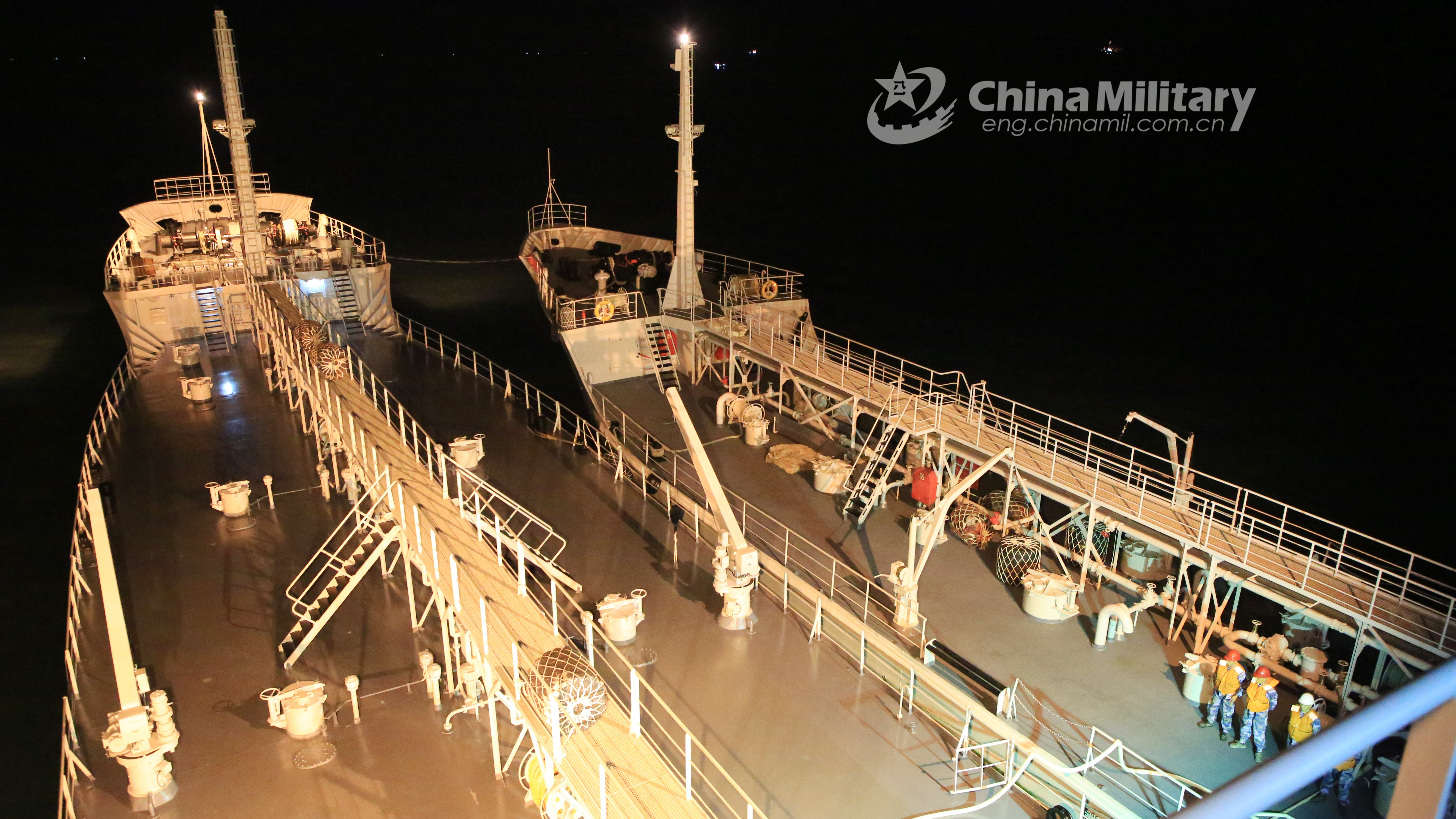 Two navy vessels attached to an auxiliary ship group under the PLA Southern Theater Command berth alongside as they perform in-port replenishment at night during a maritime training exercise in waters of the South China Sea in early December, 2020. (eng.chinamil.com.cn/Photo by Wu Huanqing)