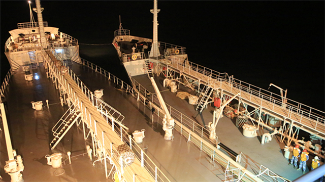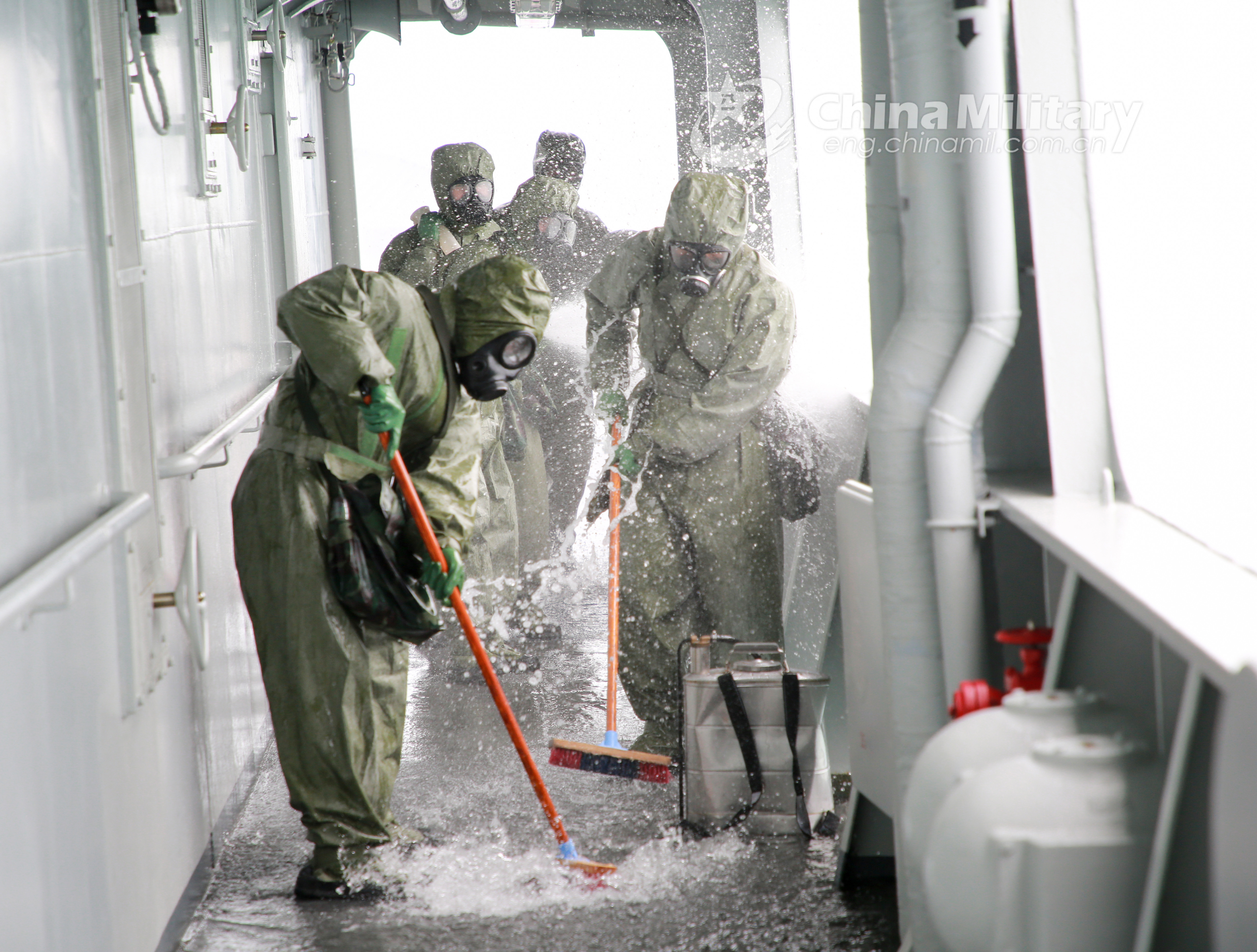 Sailors wearing Mission-Oriented Protective Posture (MOPP) gears conduct chemical decontamination aboard a service ship during a maritime training exercise conducted by a naval auxiliary ship group under the PLA Southern Theater Command in waters of the South China Sea in early December, 2020. (eng.chinamil.com.cn/Photo by Wu Huanqing)