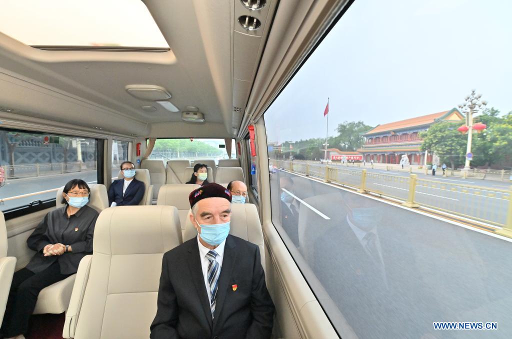 A motorcade takes Memetjan Wumer (front), Zhang Guimei (1st L) and Wu Tianyi (1st R) to the Great Hall of the People in Beijing, capital of China, June 29, 2021. The awarding ceremony of the July 1 Medal started on Tuesday morning at the Great Hall of the People in Beijing. (Xinhua/Yue Yuewei)