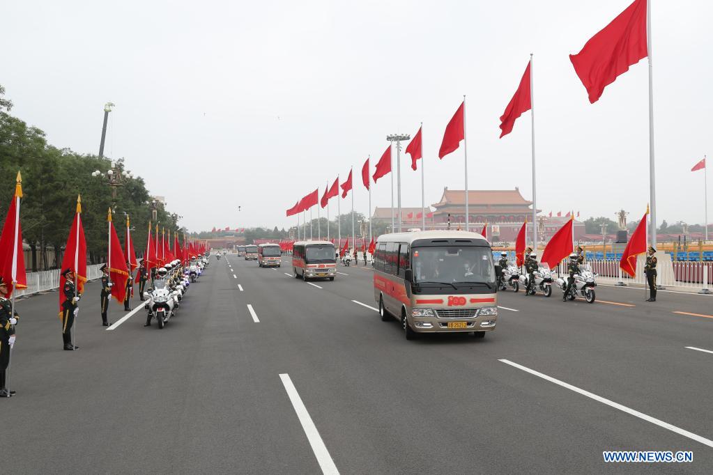 The motorcade carrying recipients of the July 1 Medal is accompanied by motorcycle escorts on the way to the Great Hall of the People in Beijing, capital of China, June 29, 2021. A ceremony is about to be held Tuesday morning to award the July 1 Medal, the highest honor in the Communist Party of China (CPC), to outstanding Party members for the first time. The ceremony will be held at the Great Hall of the People in Beijing. (Xinhua/Ding Haitao)