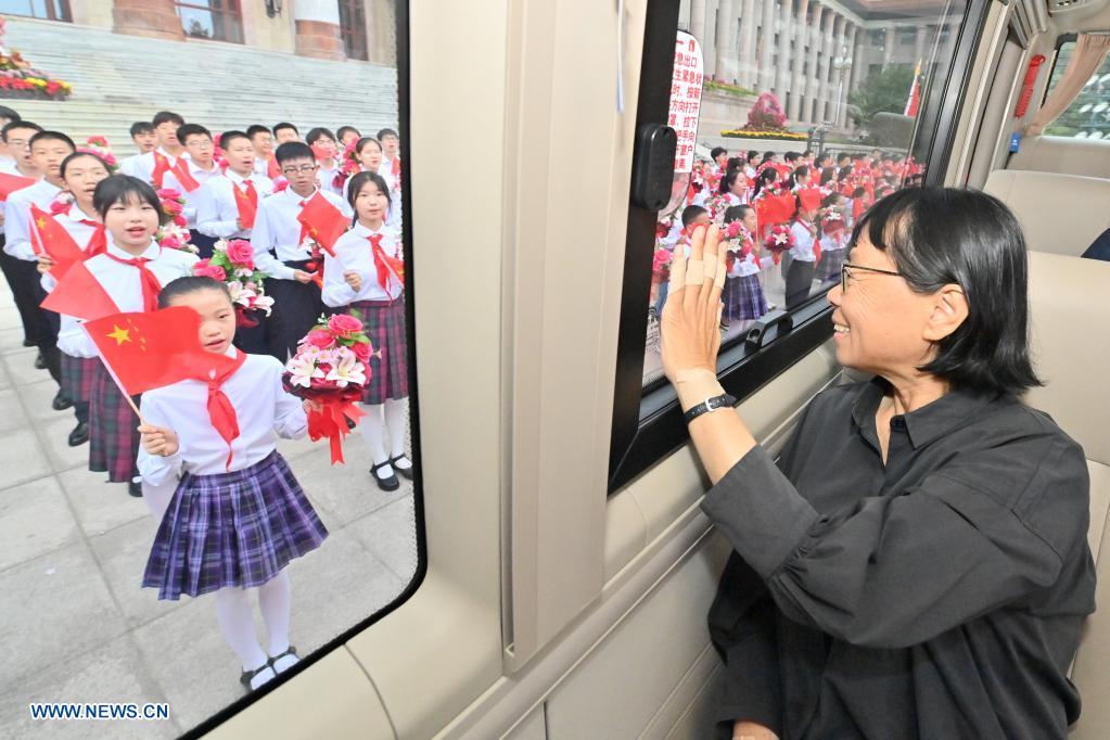 Zhang Guimei waves to children upon her arrival at the Great Hall of the People in Beijing, capital of China, June 29, 2021. A ceremony is about to be held Tuesday morning to award the July 1 Medal, the highest honor in the Communist Party of China (CPC), to outstanding Party members for the first time. The ceremony will be held at the Great Hall of the People in Beijing. (Xinhua/Yue Yuewei)