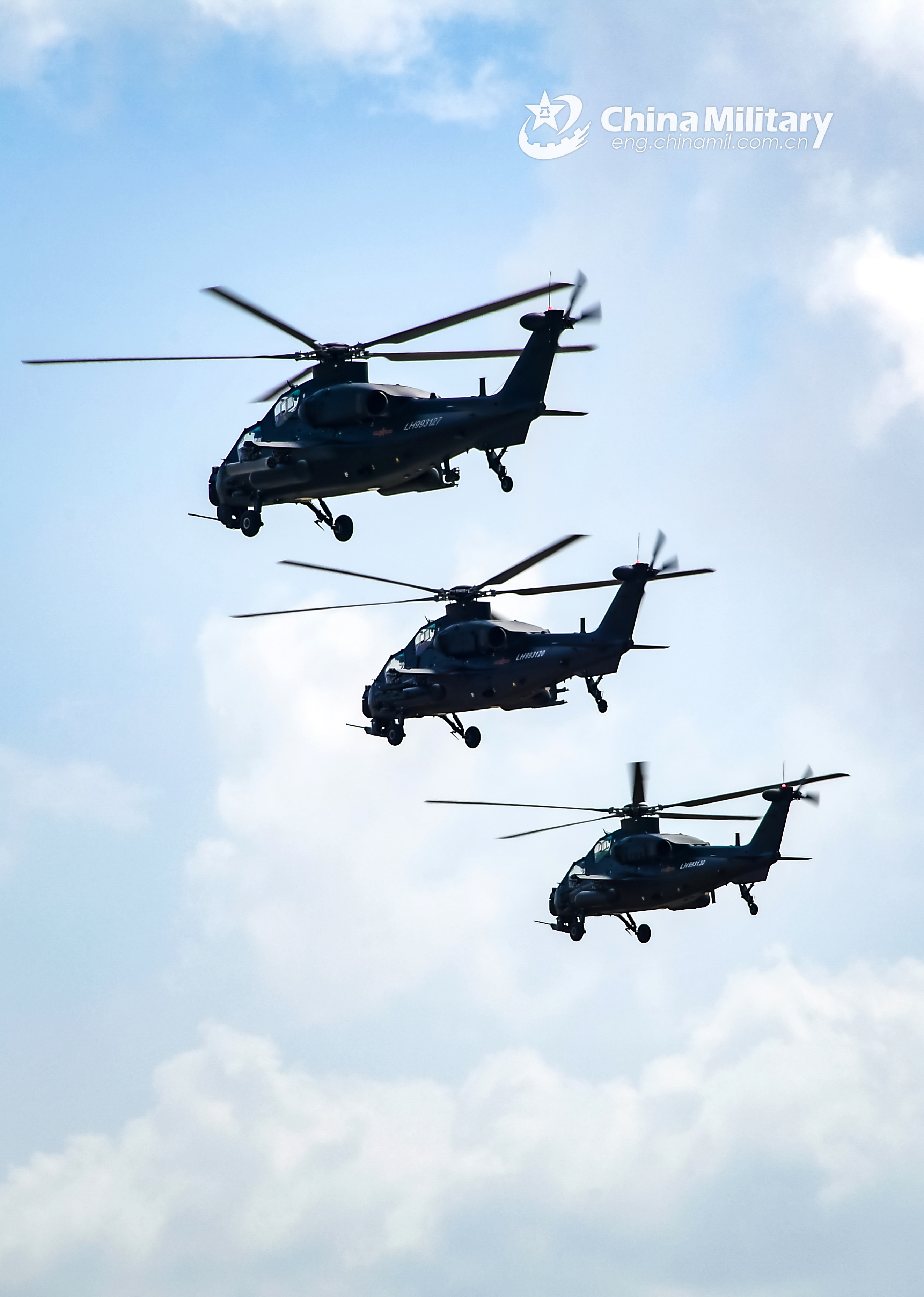 Multi-type attack and transport helicopters attached to an army aviation brigade under the PLA 73rd Group Army fly in formation during a flight training exercise. The training exercise mainly focused on such subjects as ultra-low altitude formation attack, concealment and defense penetration, as well as weapon-using escort. (eng.chinamil.com.cn/Photo by Li Shilong)
