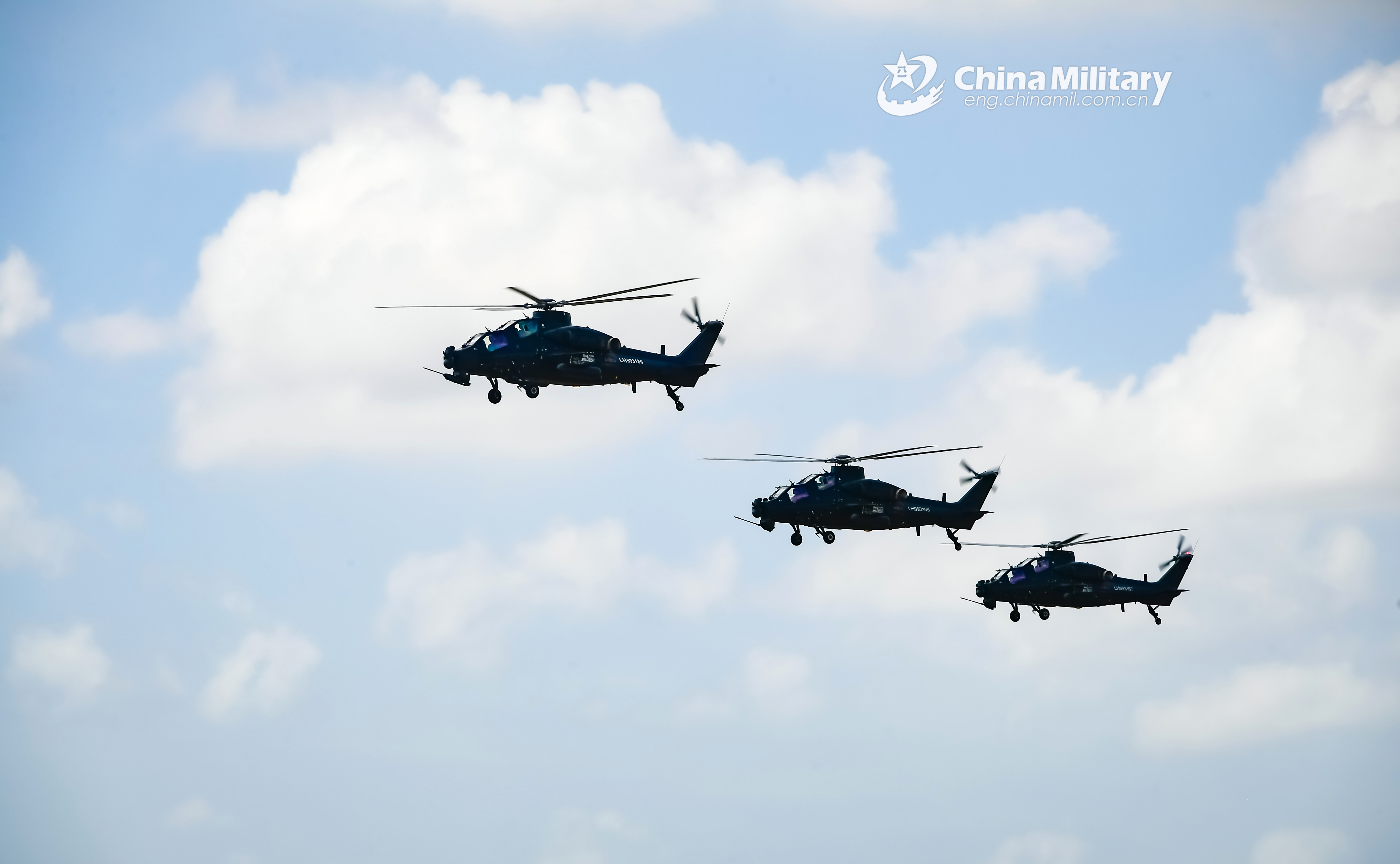 Multi-type attack and transport helicopters attached to an army aviation brigade under the PLA 73rd Group Army fly in formation during a flight training exercise. The training exercise mainly focused on such subjects as ultra-low altitude formation attack, concealment and defense penetration, as well as weapon-using escort. (eng.chinamil.com.cn/Photo by Li Shilong)