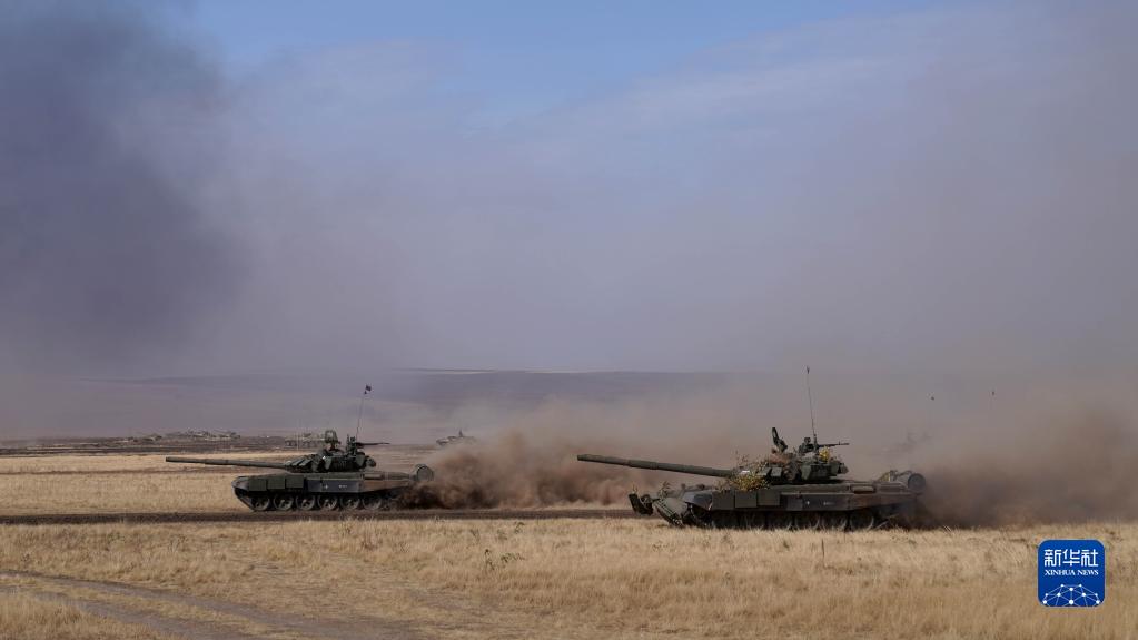 Tanks of the ground assault group assigned tor the multinational joint forces rumble through the field during the main stage drill of the SCO Peace Mission-2021 joint anti-terrorism military exercise at the Donguz training range in Orenburg Oblast, Russia, on September 23, 2021. (eng.chinamil.com.cn/Photo by Mei Shixiong)