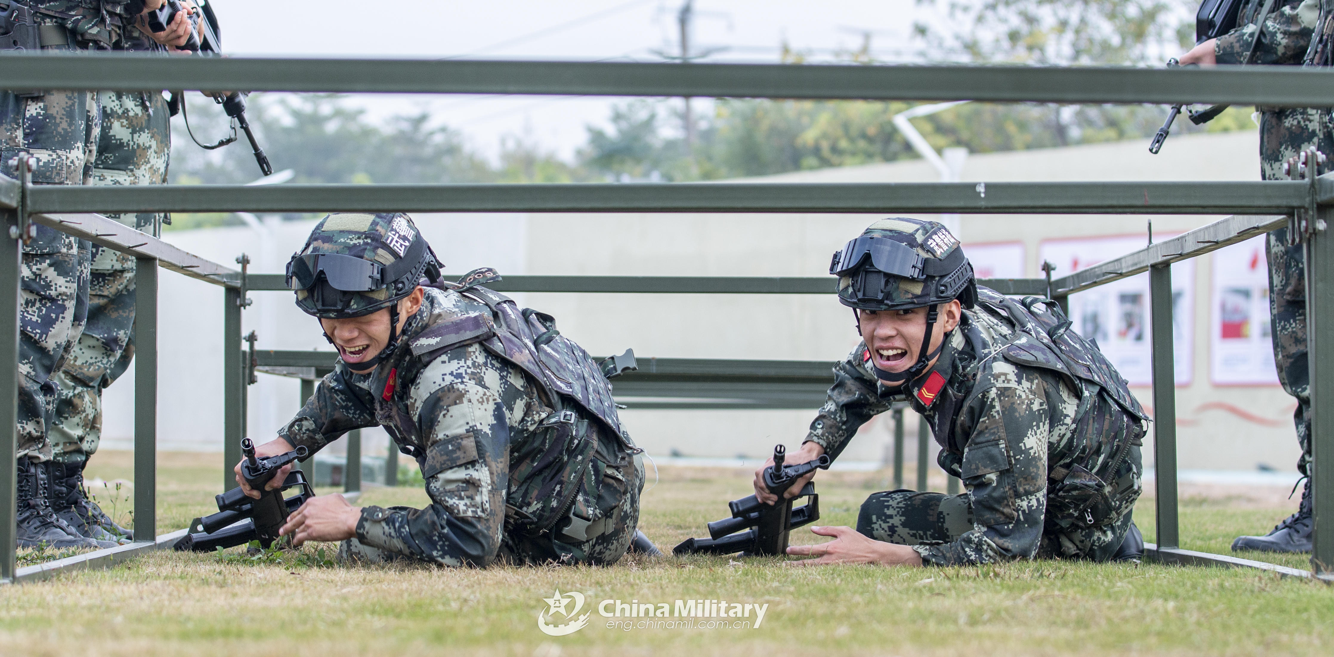 Soldiers assigned to the Beihai detachment under the People's Armed Police (PAP) Force Guangxi Corps quickly crawl through low hurdles during a multi-subject tactical coordination training exercise in South China's Guangxi Zhuang Autonomous Region on January 7, 2022. (eng.chinamil.com.cn/Photo by Yu Haiyang)