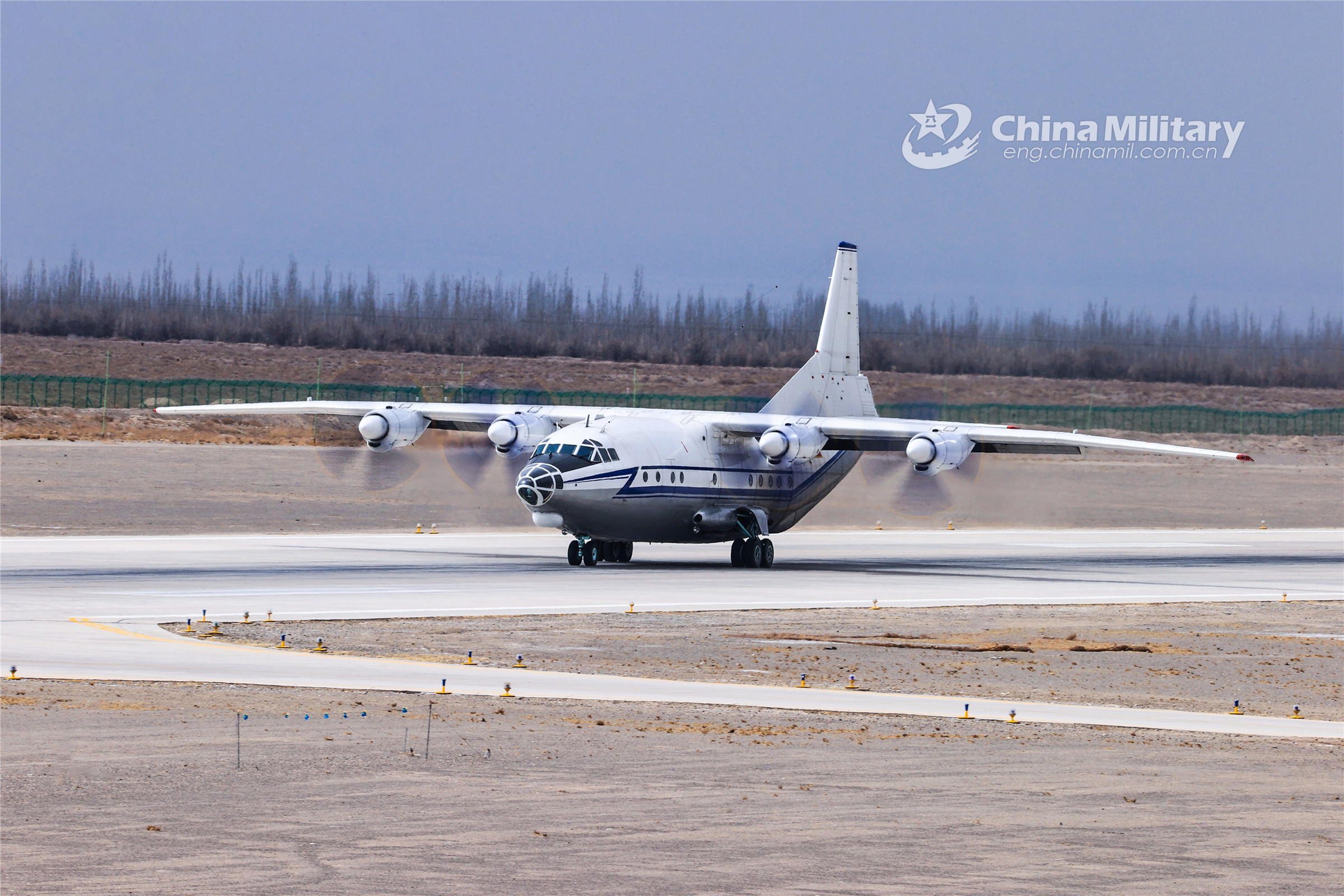 A Y-8 transport aircraft attached to a brigade with the PLA Air Force Xi'an Flight Academy taxis on the runway before takeoff for a cross-area airlift course on March 13, 2022. (eng.chinamil.com.cn/Photo by Cui Baoliang)