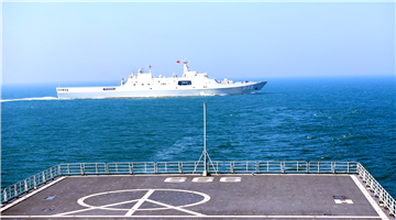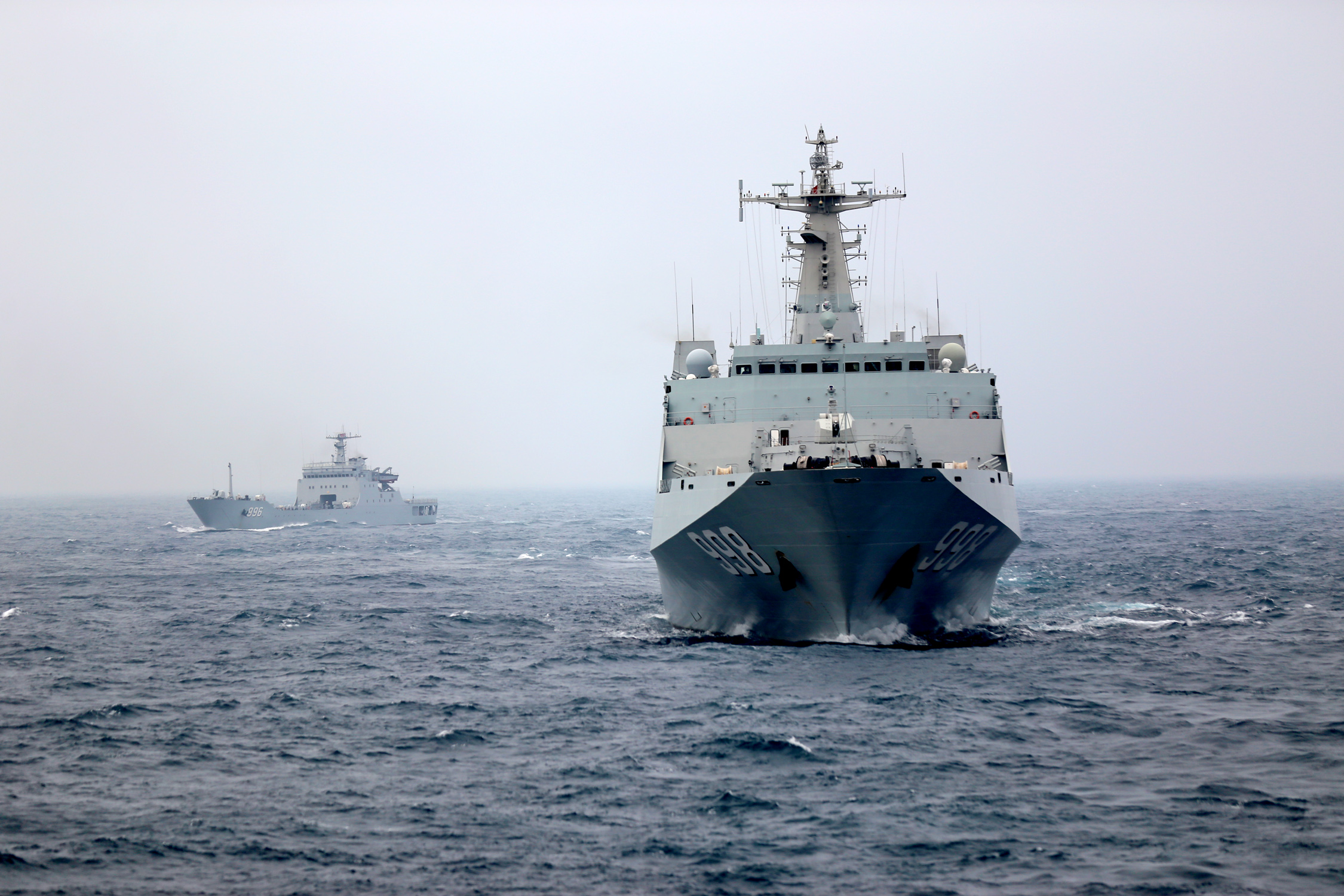 The amphibious dock landing ship Kunlunshan (Hull 998),front, and an amphibious tank landing ship, hull number 996, steam in formation during the maritime live-fire training in waters of the South China Sea from January 17 to 19, 2018. They are attached to a landing ship flotilla with the South China Sea Fleet under the PLA Navy. (eng.chinamil.com.cn/Photo by Liu Jian)