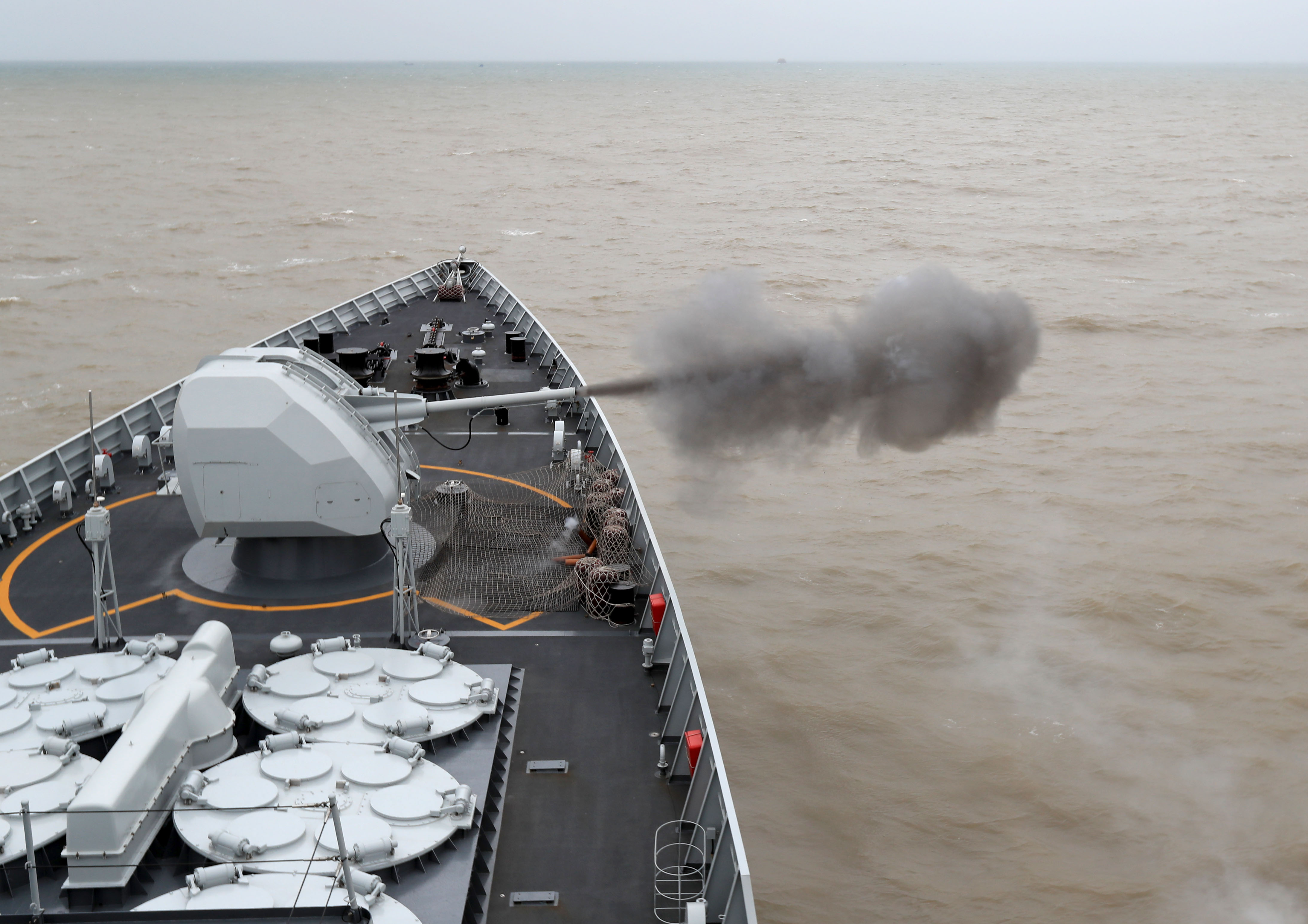 The guided-missile destroyer Changchun (Hull 150) attached to a destroyer flotilla with the East China Sea Fleet under the PLA Navy fires its main gun against simulated sea targets during a maritime live-fire training exercise in waters of the East China Sea on January 25, 2018. (eng.chinamil.com.cn/Photo by Lin Jian)