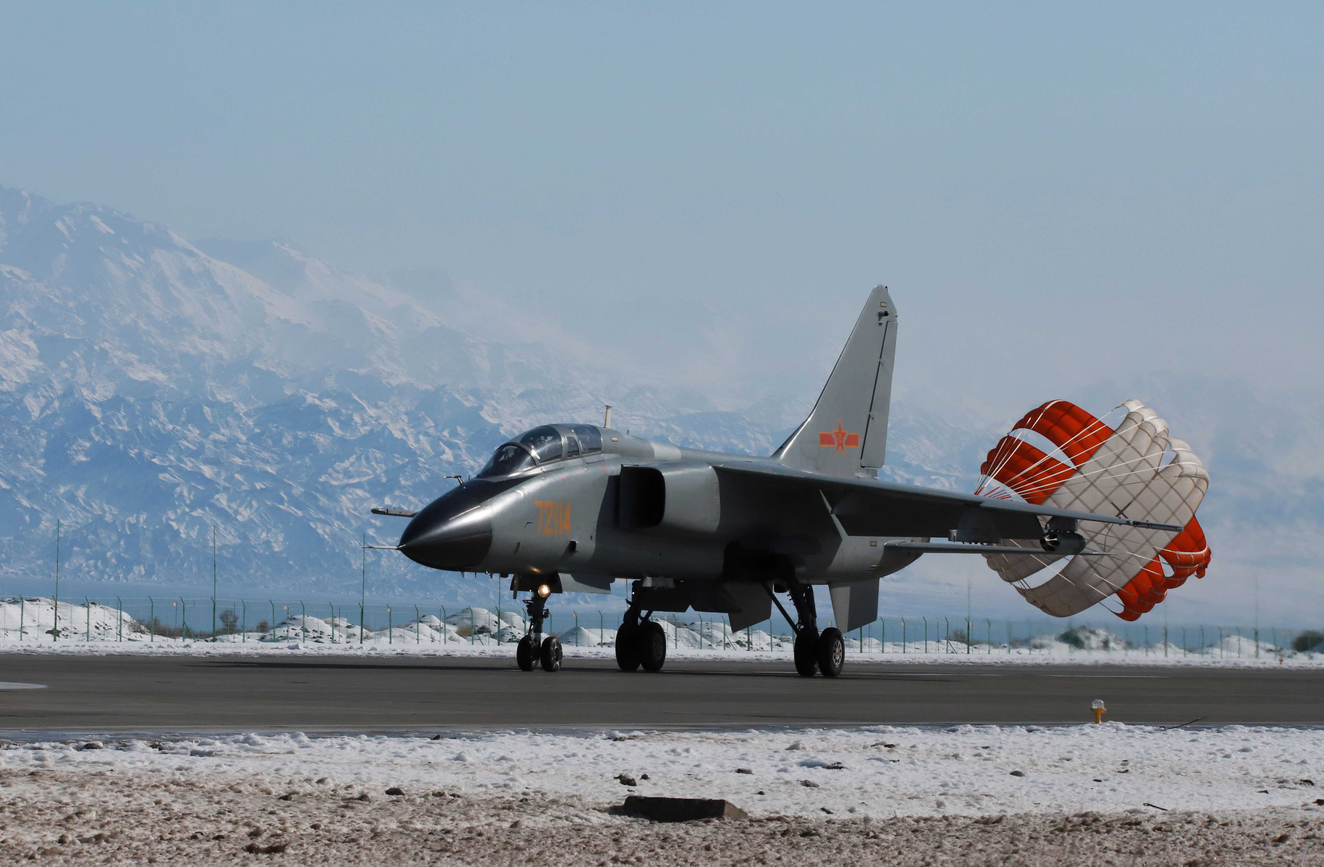 A JH-7 fighter bomber attached to an aviation brigade of the air force under the PLA Western Theater Command deploys its drogue parachute to slow itself after landing at a military airfield at the foot of the Tianshan Mountains in late March, 2018. (eng.chinamil.com.cn/Photo by Wang Xiaofei)