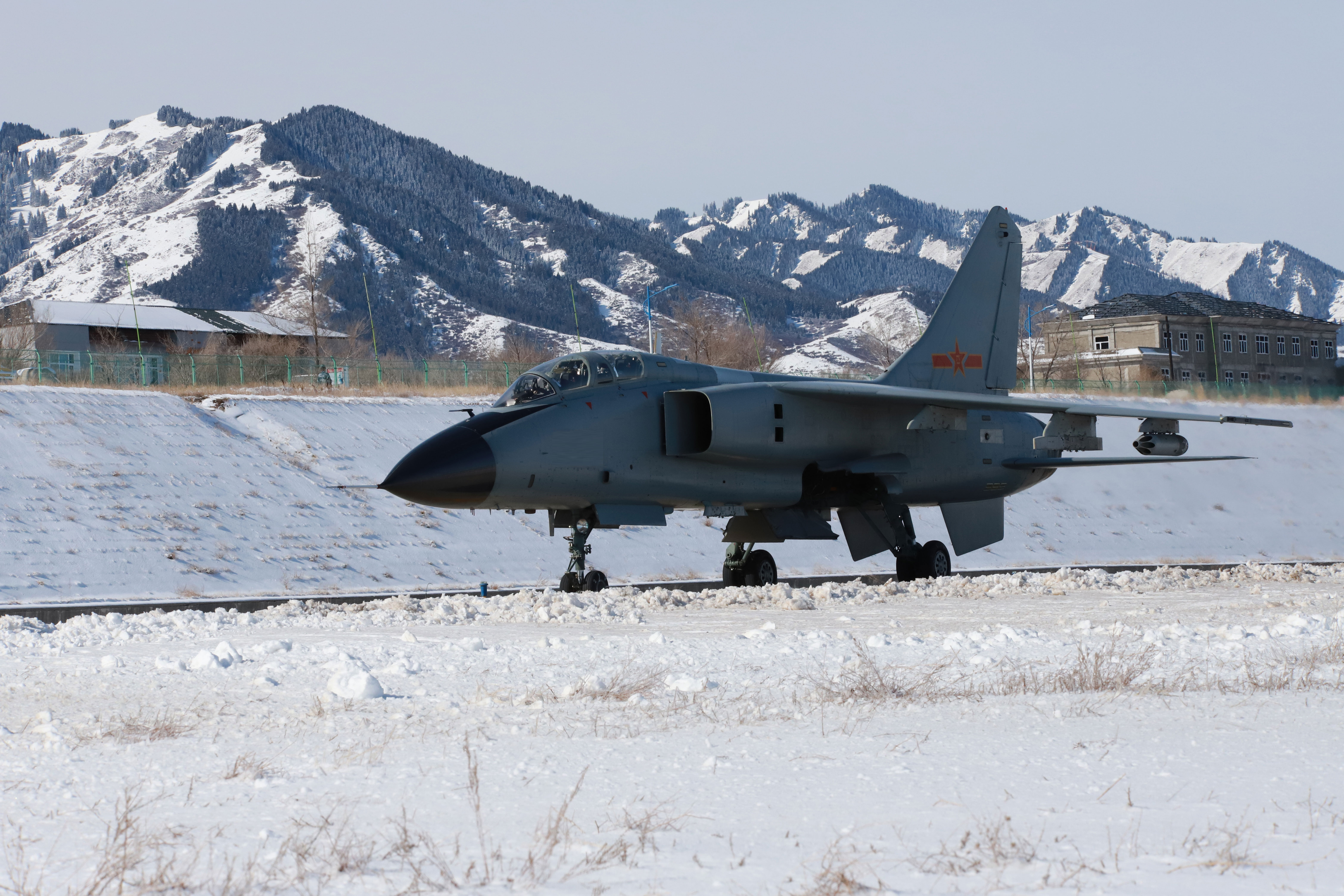 A JH-7 fighter bomber attached to an aviation brigade of the air force under the PLA Western Theater Command taxies to the parking apron after landing at a military airfield at the foot of the Tianshan Mountains in late March, 2018. (eng.chinamil.com.cn/Photo by Wang Xiaofei)