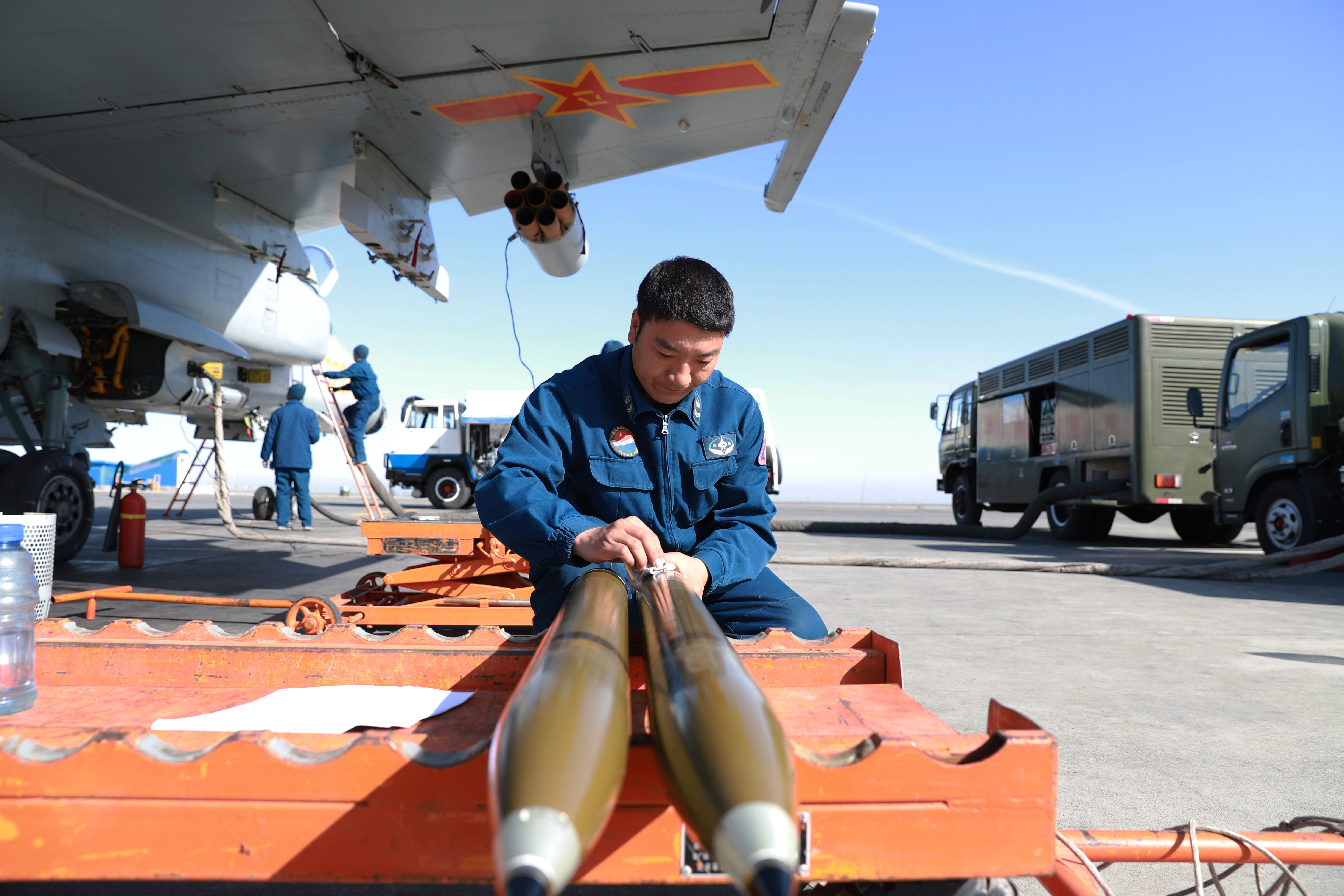 A maintenance man assigned to an aviation brigade of the air force under the PLA Western Theater Command inspects the ammunition prior to flight training at the foot of the Tianshan Mountains in late March, 2018. (eng.chinamil.com.cn/Photo by Wang Xiaofei)