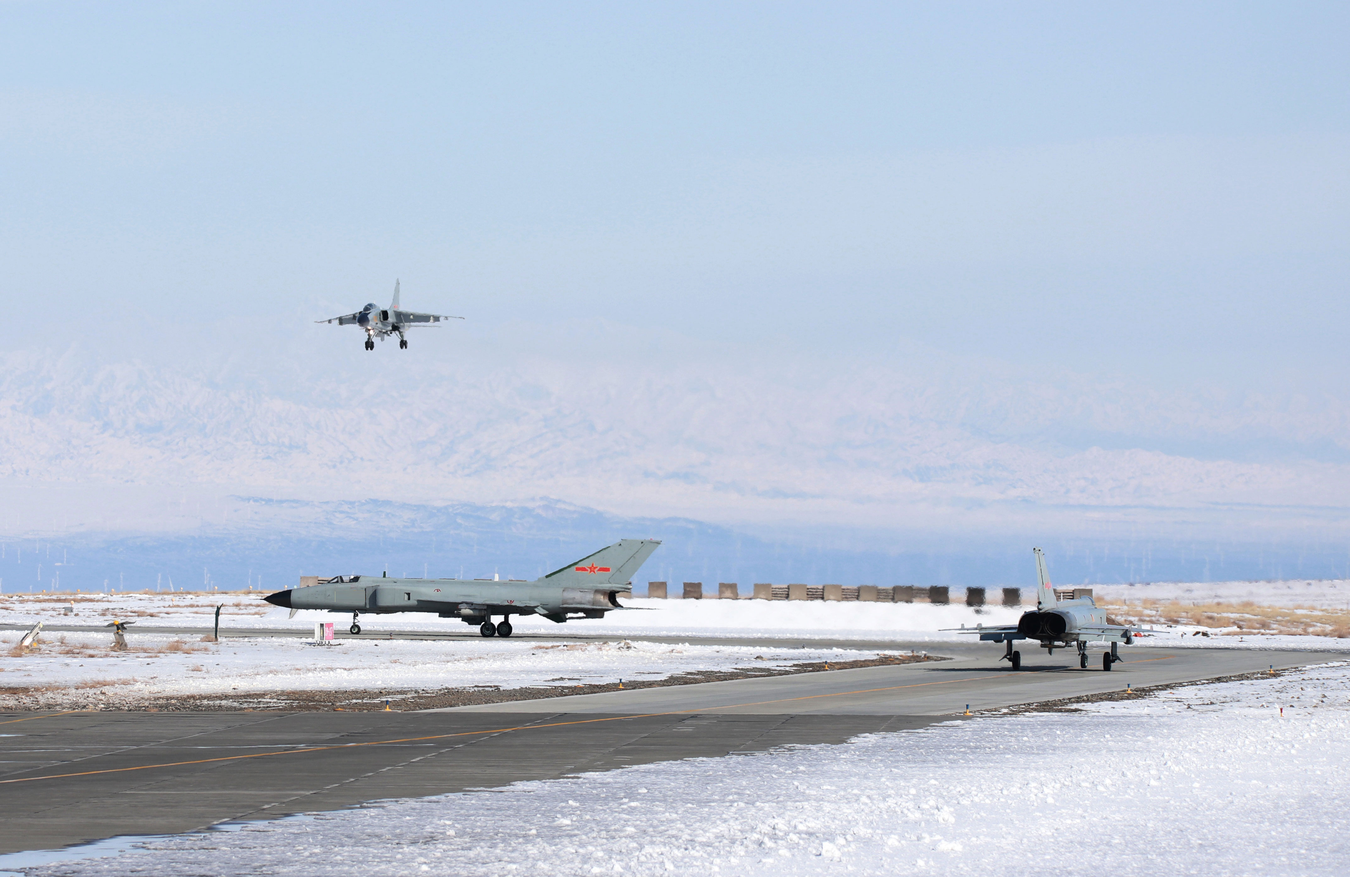 Multi-type planes attached to an aviation brigade of the air force under the PLA Western Theater Command take off for a combat sortie successively from a military airfield at the foot of the Tianshan Mountains in late March, 2018. (eng.chinamil.com.cn/Photo by Wang Xiaofei)