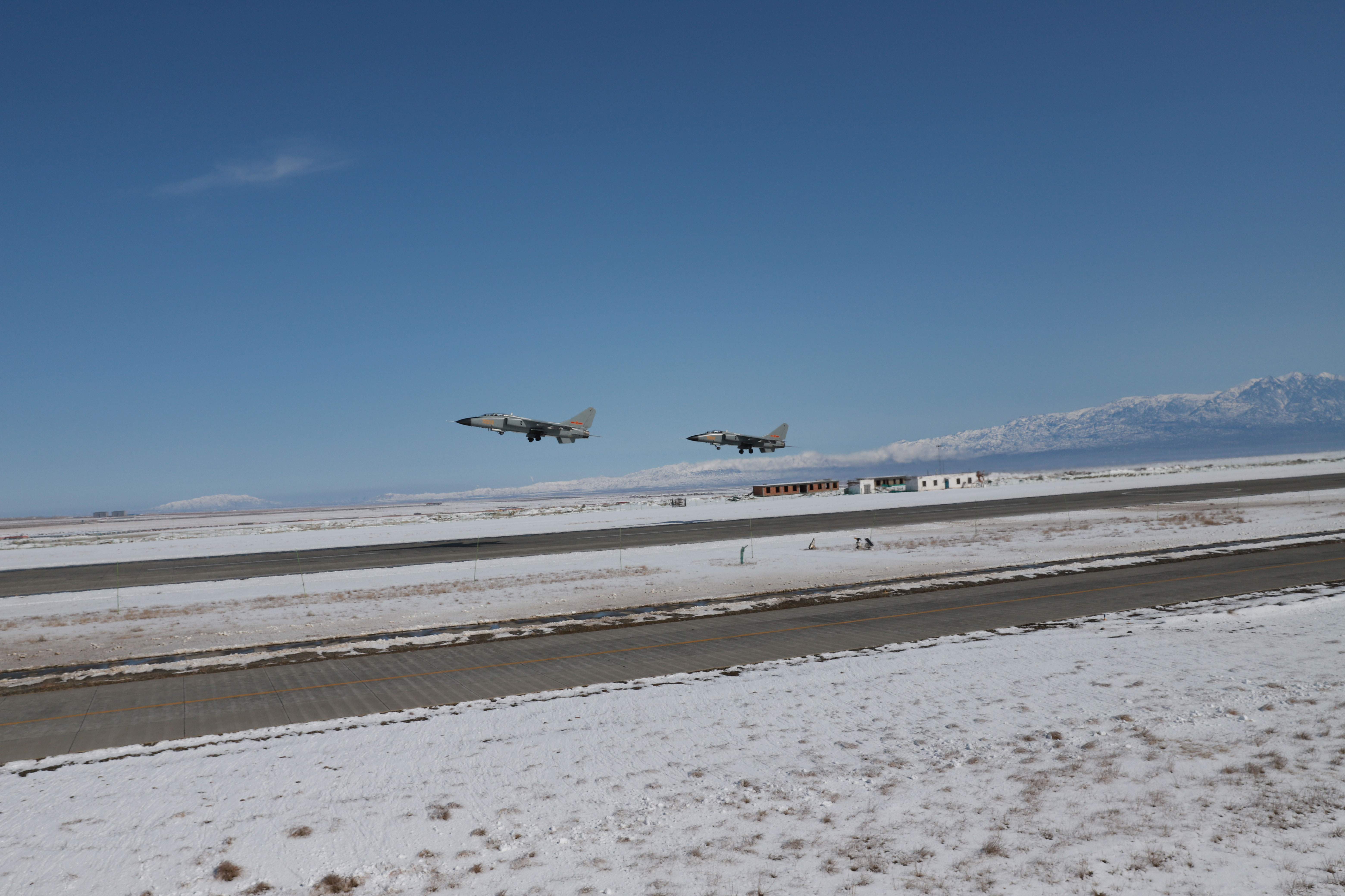 Two JH-7 fighter bombers attached to an aviation brigade of the air force under the PLA Western Theater Command take off for a sortie near the Tianshan Mountains in late March, 2018. (eng.chinamil.com.cn/Photo by Wang Xiaofei)
