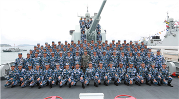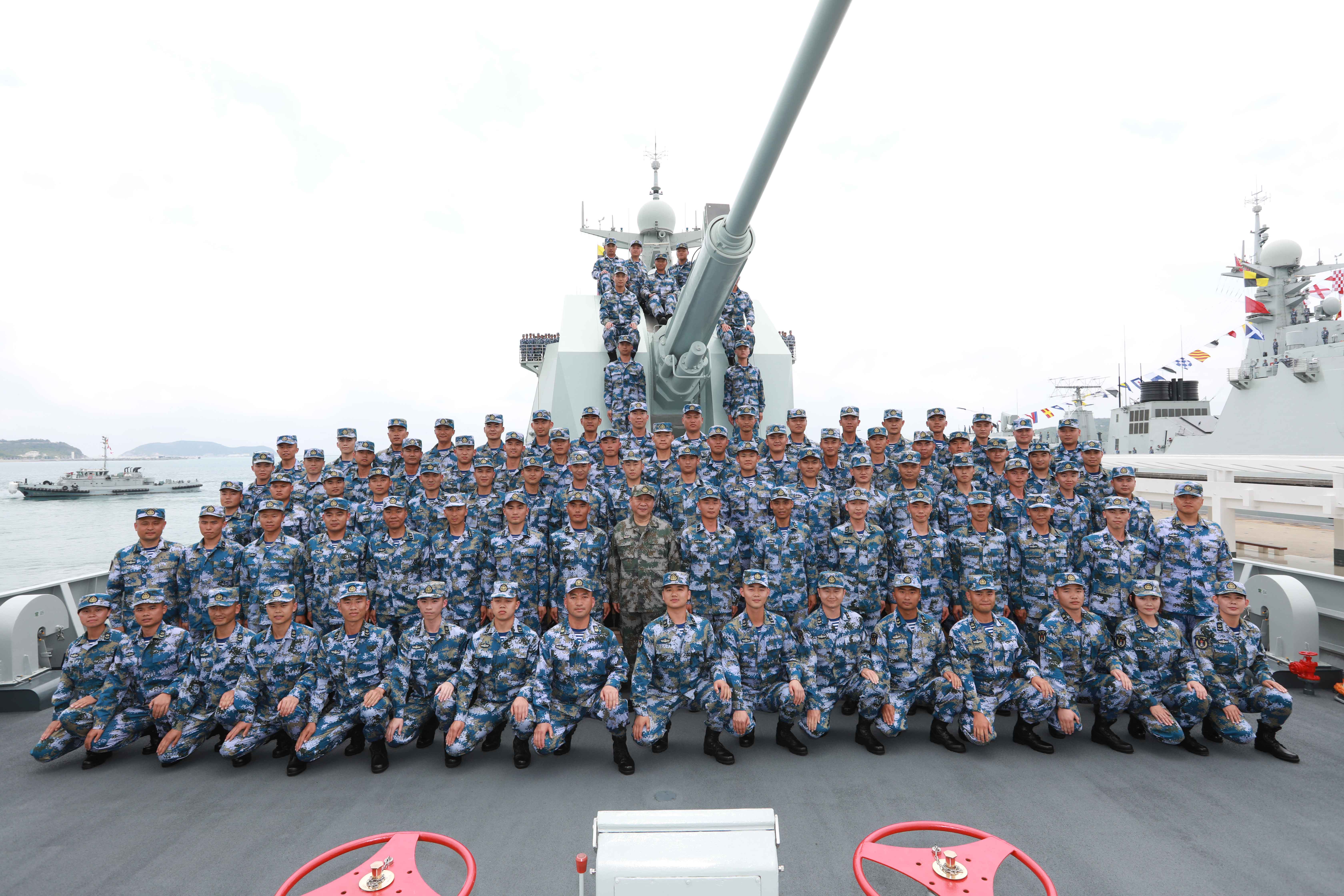 Chinese President Xi Jinping, who is also general secretary of the Communist Party of China (CPC) Central Committee and chairman of the Central Military Commission (CMC), poses a group photo with sailors aboard the guided-missile destroyer Changsha (Hull 173) after reviewing the PLA Navy parade in the South China Sea on the morning of April 12, 2018. (ChinaMil / Photo by Zhou Chaorong)