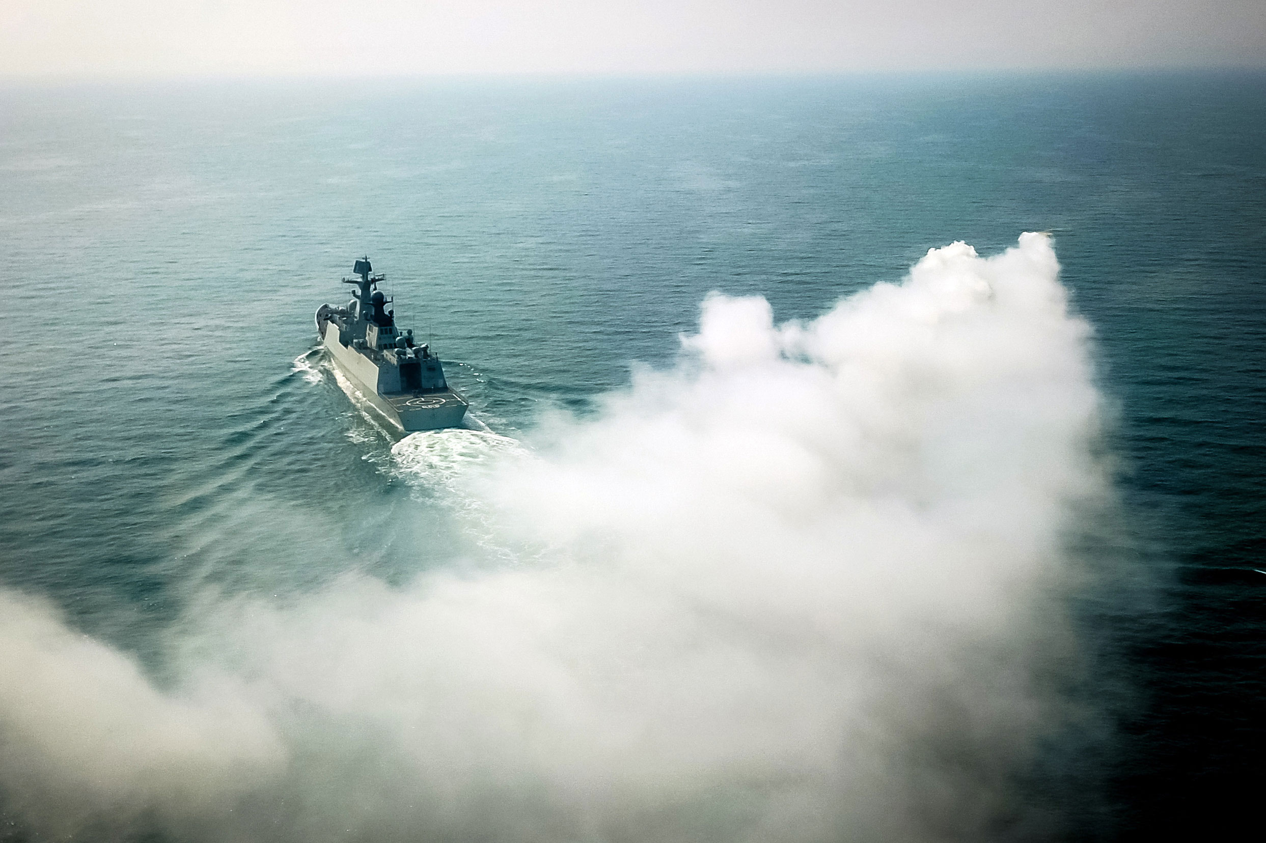 The guided-missile frigate Rizhao (Hull 598) attached to a destroyer flotilla with the navy under the PLA Northern Theater Command maneuvers on the sea after deploying smoke for concealment during a maritime training exercise in waters of the Yellow Sea from April 17 to 20, 2018. (eng.chinamil.com.cn/Photo by Yi Xing)
