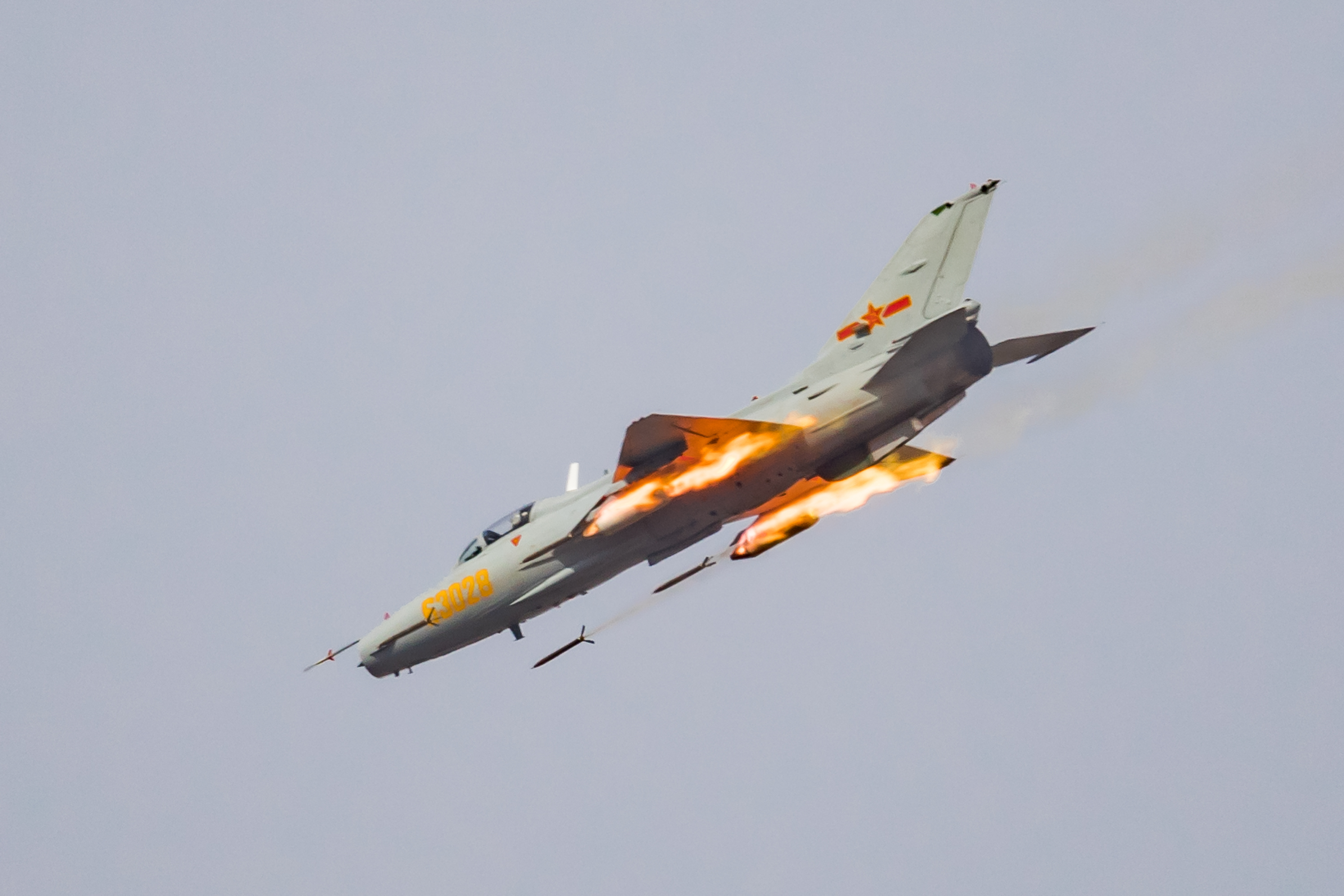 A J-7 fighter jet fires rockets at simulated ground targets during the Golden Dart - 2018 air combat tactics competitive assessment. The PLA Air Force kicked off its annual competitive assessment codenamed Golden Dart - 2018 in northeastern China on April 18, 2018. Over 200 pilots from dozens of Air Force's combat units competed for the "Golden Dart" award, a top prize for the best skillful pilots in the fierce air penetration and assault operations against ground air defense troops. (eng.chinamil.com.cn/Photo by Yang Pan)