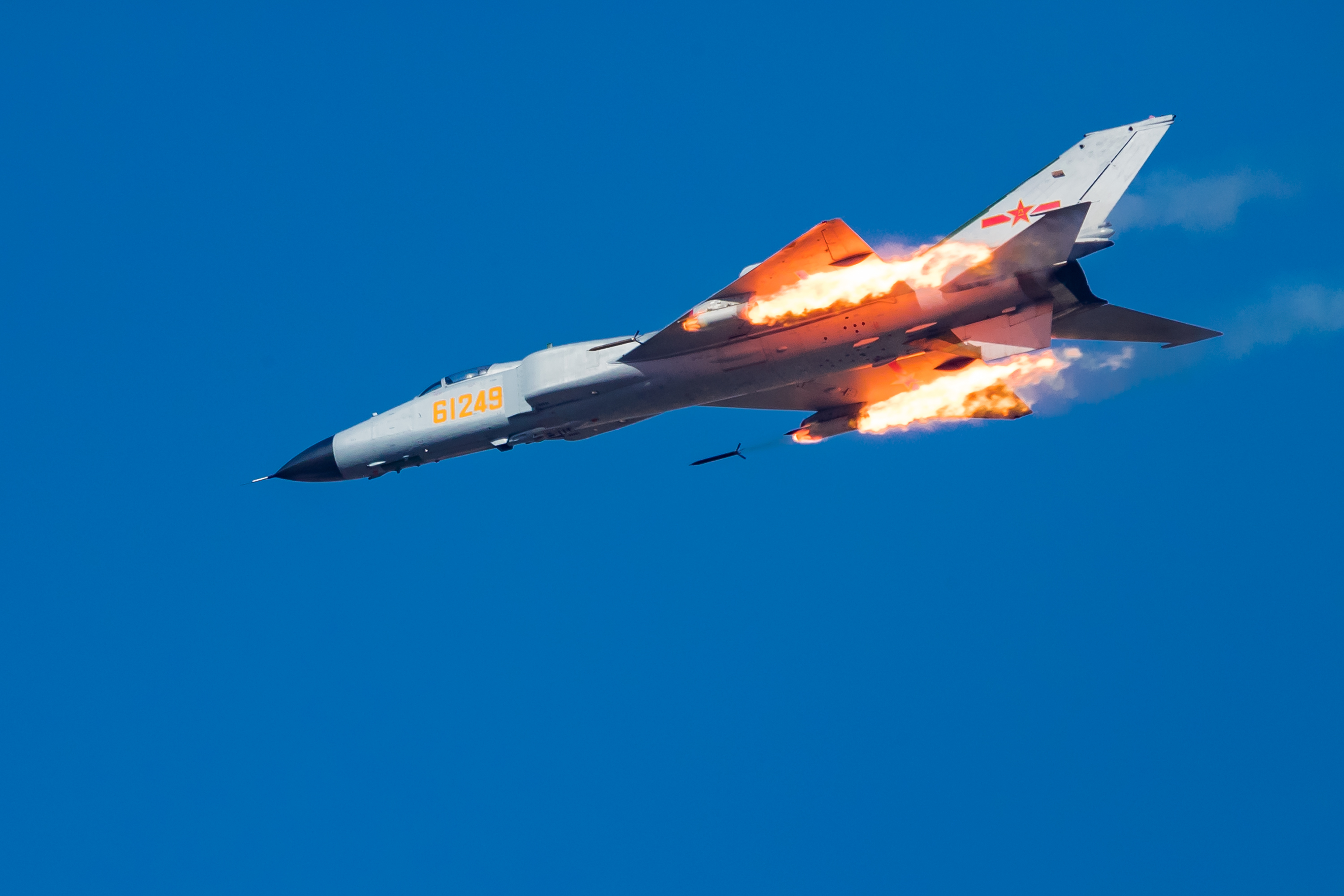 A J-8DF fighter jet fires missiles at simulated ground targets during the Golden Dart - 2018 air combat tactics competitive assessment. The PLA Air Force kicked off its annual competitive assessment codenamed Golden Dart - 2018 in northeastern China on April 18, 2018. Over 200 pilots from dozens of Air Force's combat units competed for the "Golden Dart" award, a top prize for the best skillful pilots in the fierce air penetration and assault operations against ground air defense troops. (eng.chinamil.com.cn/Photo by Yang Pan)