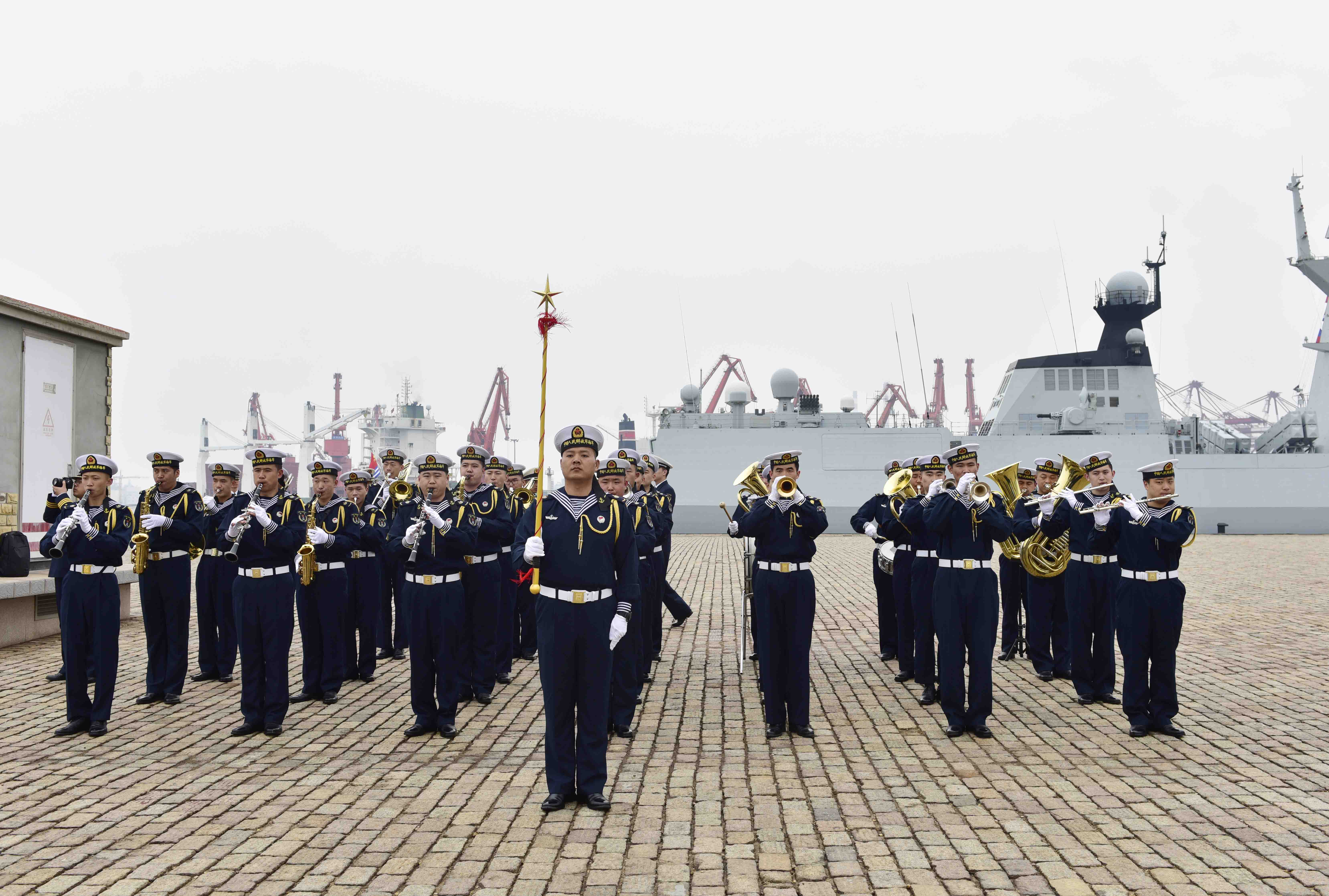PLA Navy soldiers perform at a welcome ceremony held for the visiting Singaporean frigate RSS Intrepid at a naval port in Qingdao, east China's Shandong Province on May 6, 2018. The RSS Intrepid arrived in Qingdao Sunday for a four-day visit to China. (Photo by Lai Yonglei)