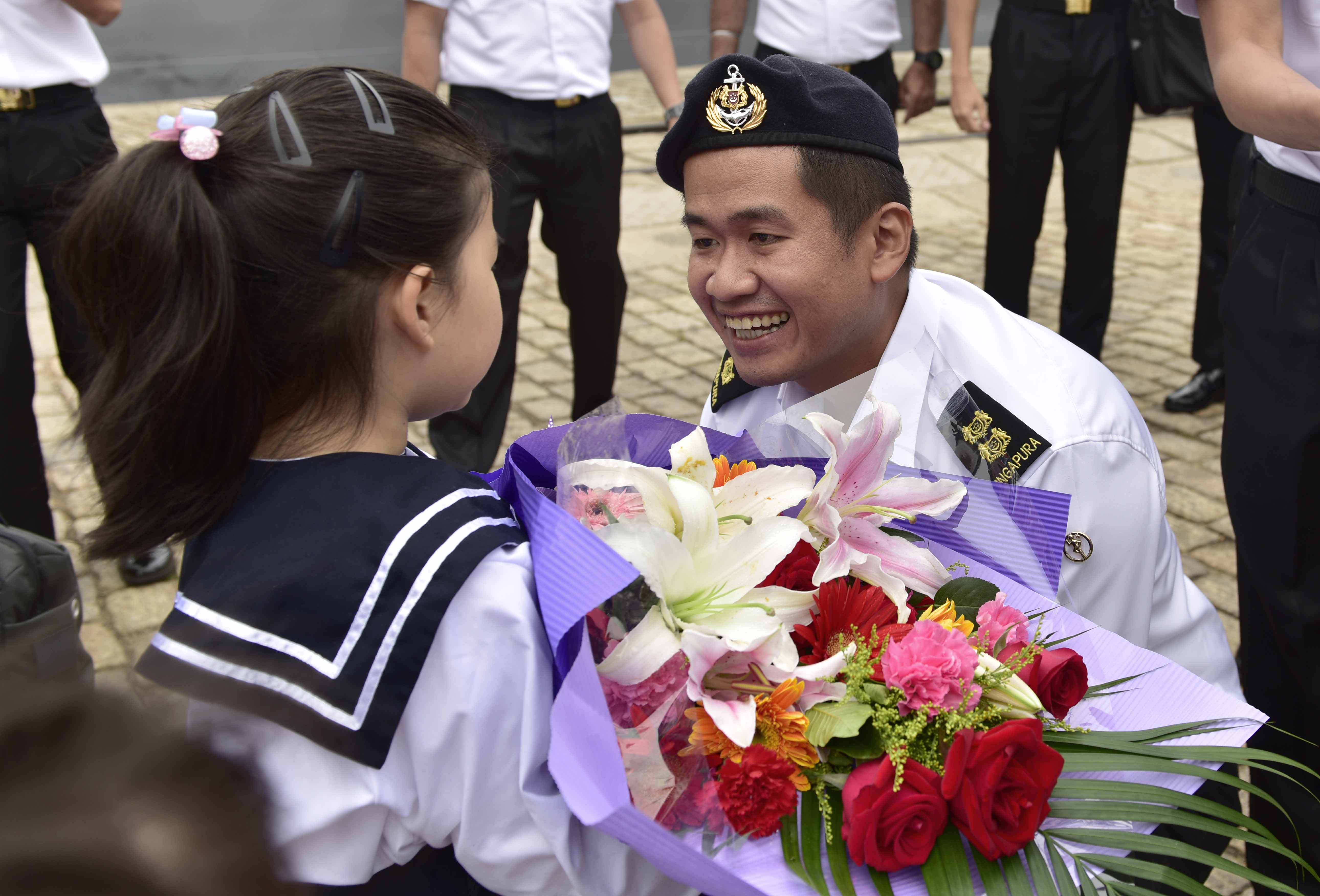 Chinese children present flowers to visiting Singaporean naval servicepersons at a naval port in Qingdao, east China's Shandong Province on May 6, 2018. The Singaporean frigate RSS Intrepid arrived in Qingdao Sunday for a four-day visit to China. (Photo by Li Yinchuan)