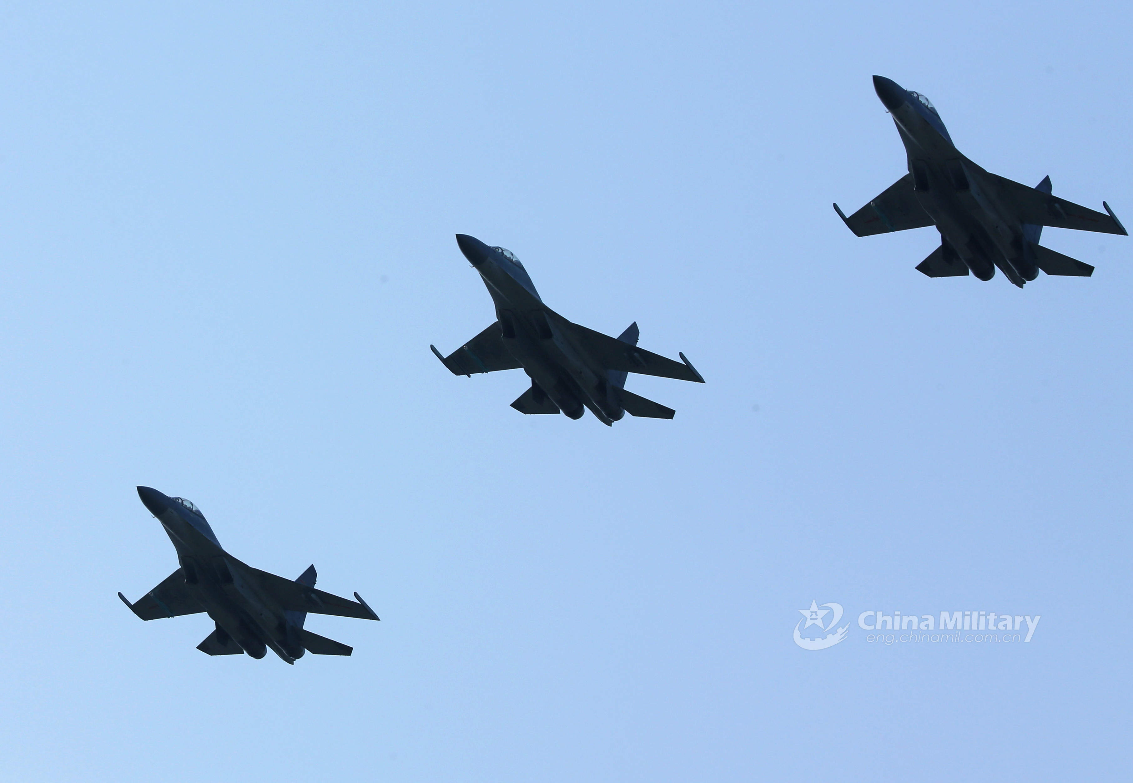 Three J-16 fighter jets attached to an aviation brigade of the air force under the PLA Western Theater Command fly in formation during a flight training exercise on May 15, 2018. (eng.chinamil.com.cn/Photo by Mu Keshuang)
