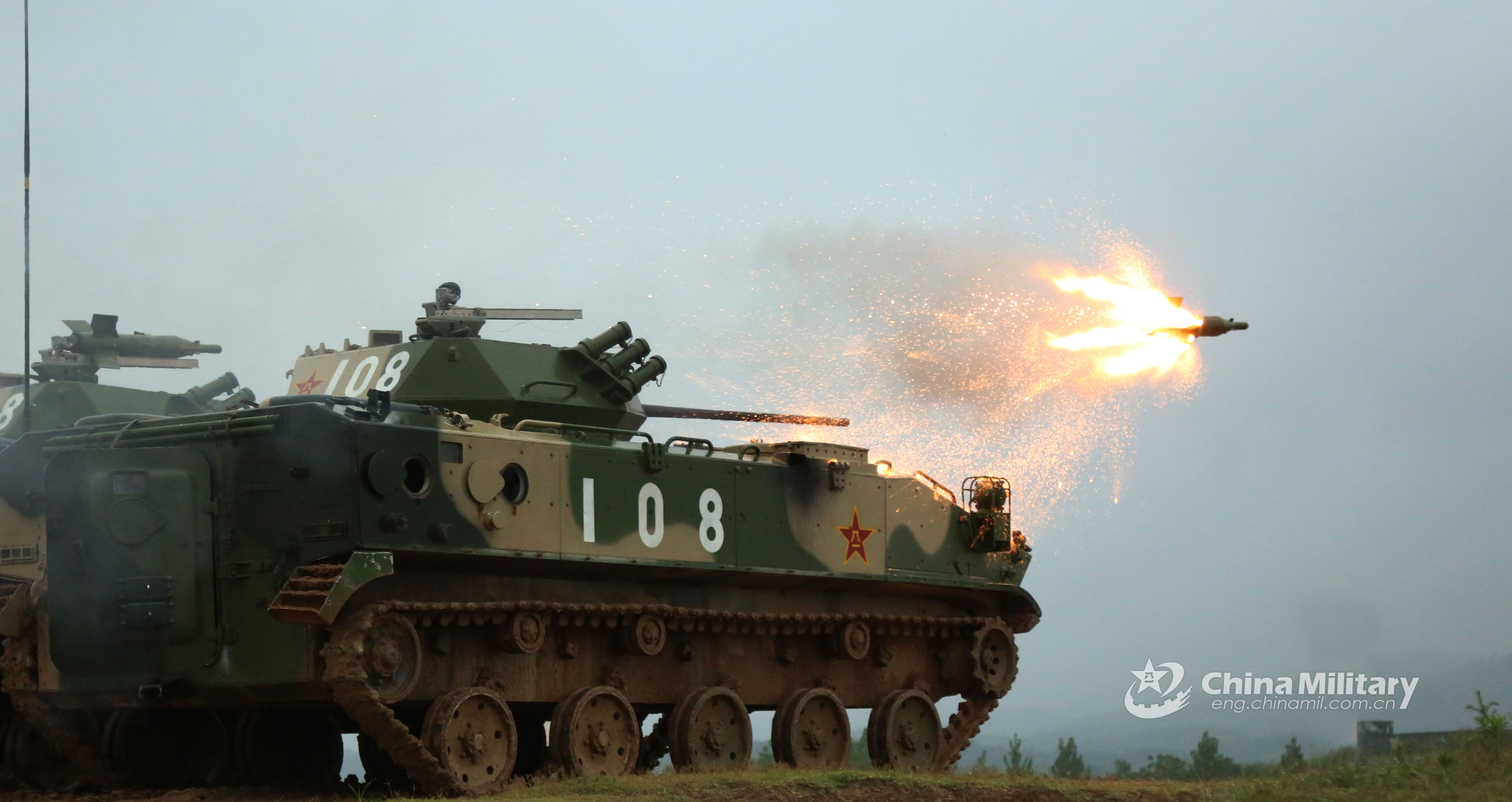 A ZBD-03 airborne armored Infantry fighting vehicle (IFV) fires anti-tank missiles at simulated targets during a live-fire training exercise from July 12 to 13, 2018. It is attached to a mechanized brigade of the airborne troops under the PLA Air Force. (eng.chinamil.com.cn/Photo by Fang Chao and He Yong)