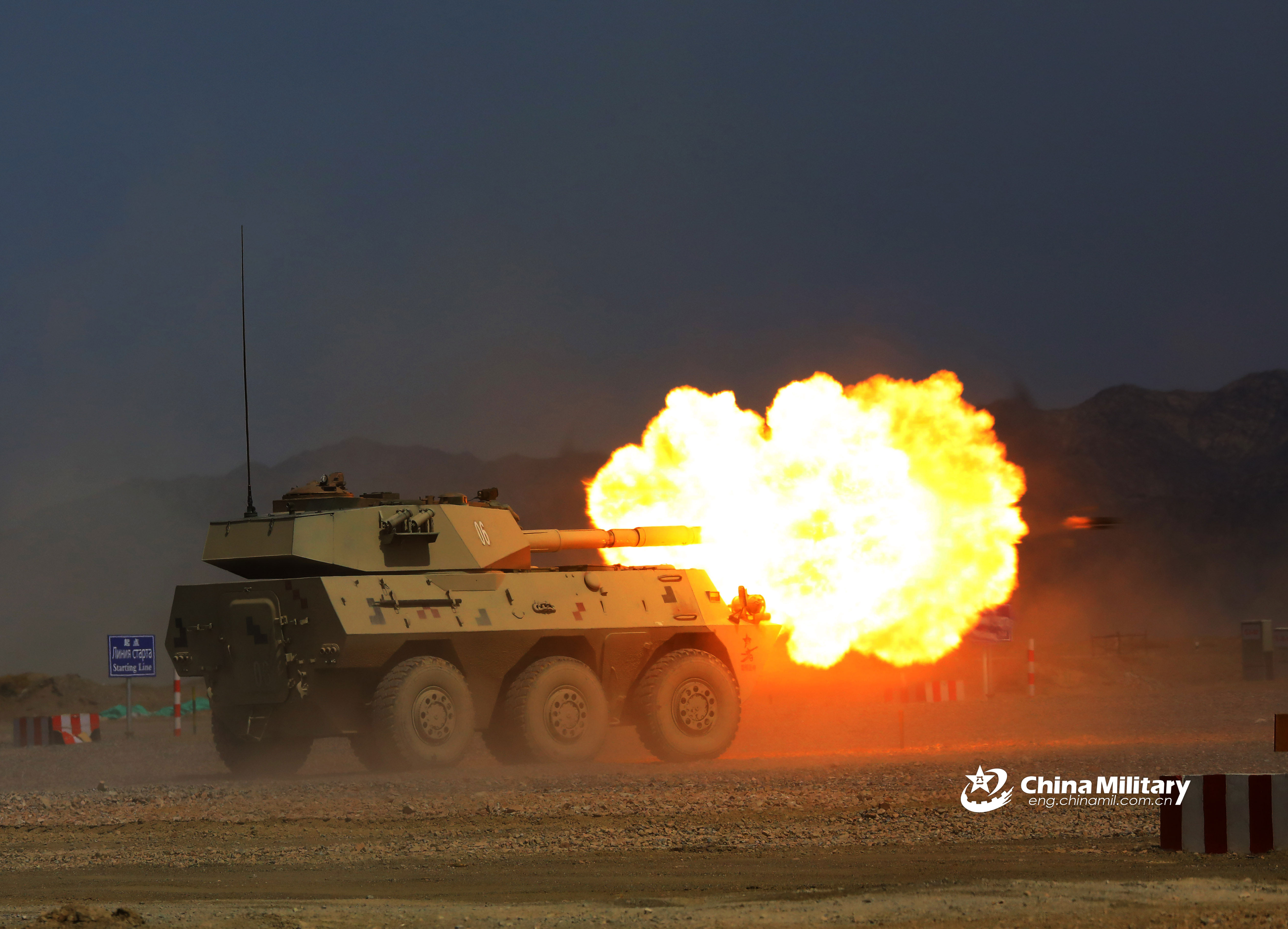 An infantry fighting vehicle performs firing skills at the opening ceremony of the International Army Games 2018 in China. Three contests, namely the "Suvorov Attack," "Clear Sky" and "Safe Route" of the International Army Games (IAG) 2018 kicked off in northwest China's Xinjiang Uygur Autonomous Region on July 29, 2018. A total of 17 teams with 358 soldiers from 10 countries, including China, Belarus, Egypt, Kazakhstan, Russia, Venezuela and Zimbabwe, are participating the games that will conclude on Aug. 11, 2018. (eng.chinamil.com.cn/Photo by Luo Xingcang, Shu Gang and Cao Chenhe)