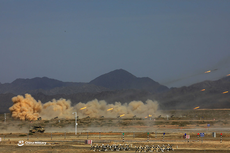 Firearms conduct a salvo of shells at the opening ceremony of the International Army Games 2018 in China. Three contests, namely the "Suvorov Attack," "Clear Sky" and "Safe Route" of the International Army Games (IAG) 2018 kicked off in northwest China's Xinjiang Uygur Autonomous Region on July 29, 2018. A total of 17 teams with 358 soldiers from 10 countries, including China, Belarus, Egypt, Kazakhstan, Russia, Venezuela and Zimbabwe, are participating the games that will conclude on Aug. 11, 2018. (eng.chinamil.com.cn/Photo by Luo Xingcang, Shu Gang and Cao Chenhe)