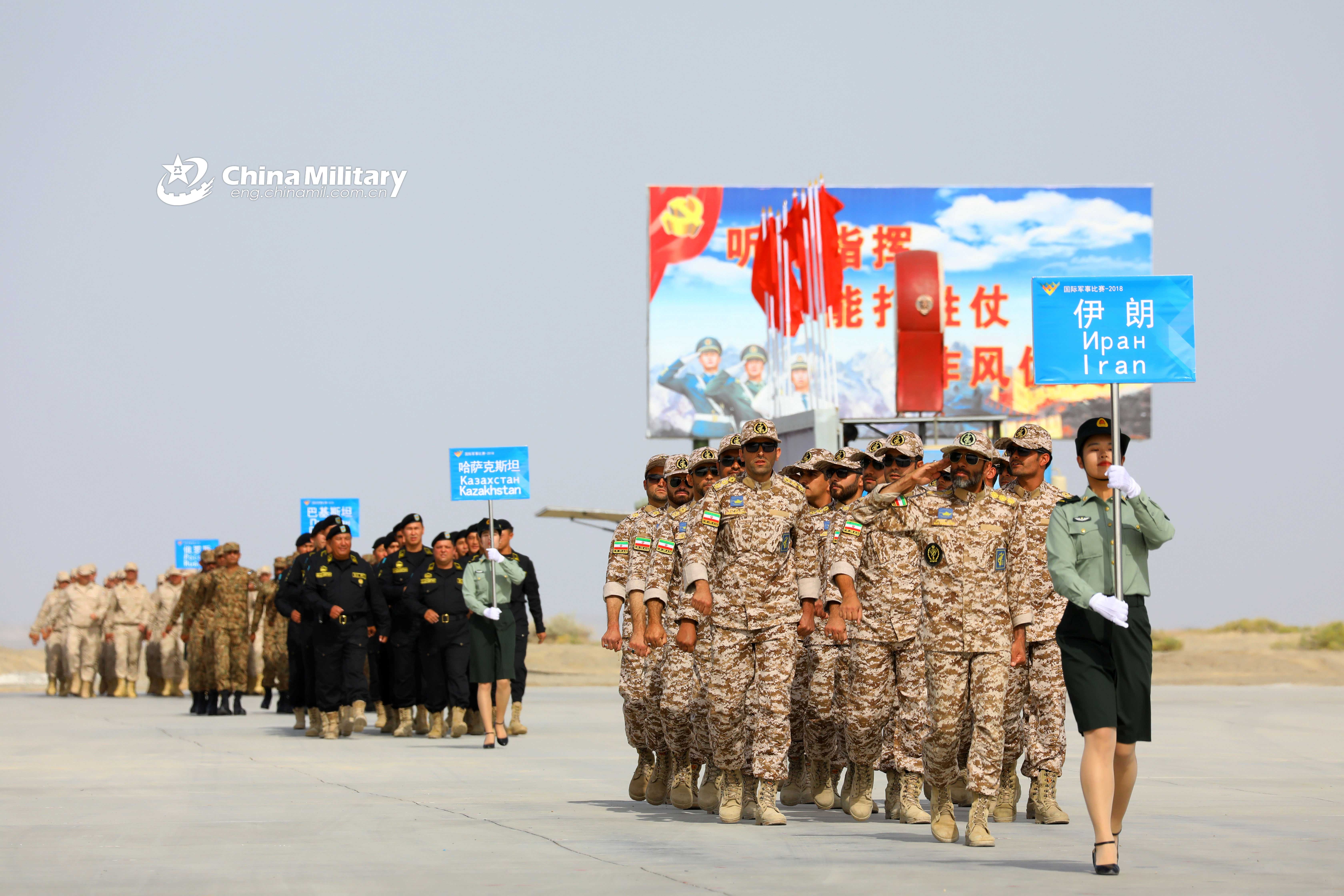 Participating teams from various countries attend the opening ceremony of the International Army Games 2018 in China. Three contests, namely the "Suvorov Attack," "Clear Sky" and "Safe Route" of the International Army Games (IAG) 2018 kicked off in northwest China's Xinjiang Uygur Autonomous Region on July 29, 2018. A total of 17 teams with 358 soldiers from 10 countries, including China, Belarus, Egypt, Kazakhstan, Russia, Venezuela and Zimbabwe, are participating the games that will conclude on Aug. 11, 2018. (eng.chinamil.com.cn/Photo by Luo Xingcang, Shu Gang and Cao Chenhe)