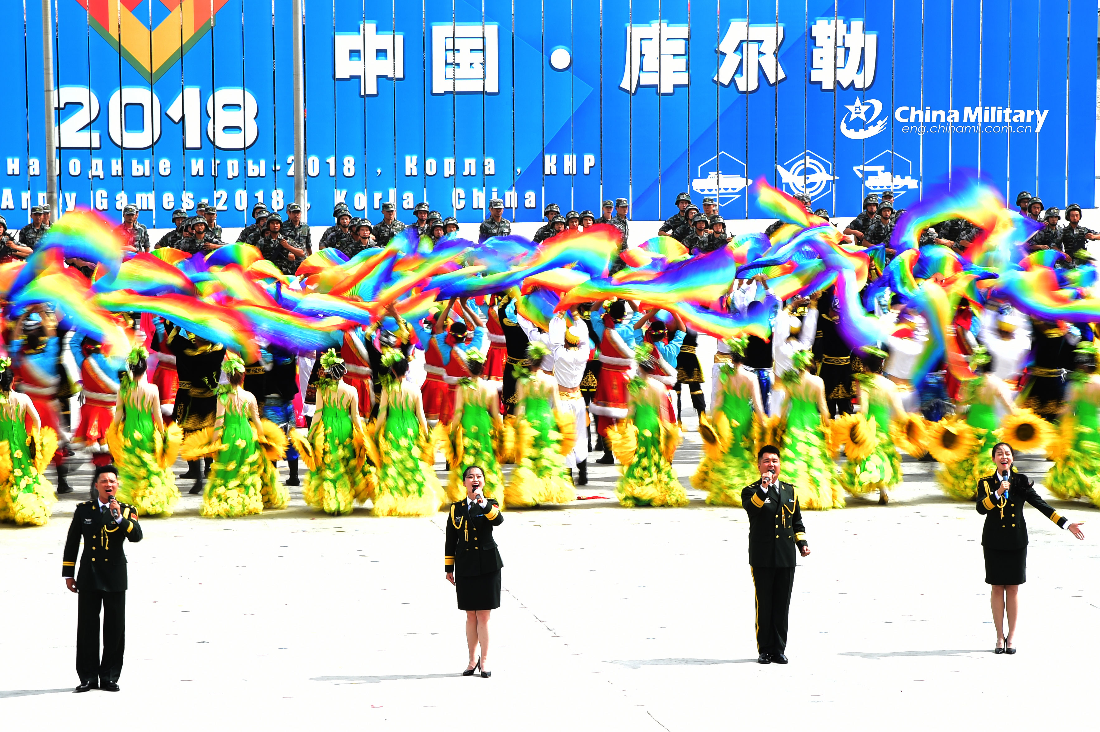 Artistic performance is held at the opening ceremony of the International Army Games 2018 in China. Three contests, namely the "Suvorov Attack," "Clear Sky" and "Safe Route" of the International Army Games (IAG) 2018 kicked off in northwest China's Xinjiang Uygur Autonomous Region on July 29, 2018. A total of 17 teams with 358 soldiers from 10 countries, including China, Belarus, Egypt, Kazakhstan, Russia, Venezuela and Zimbabwe, are participating the games that will conclude on Aug. 11, 2018. (eng.chinamil.com.cn/Photo by Luo Xingcang, Shu Gang and Cao Chenhe)