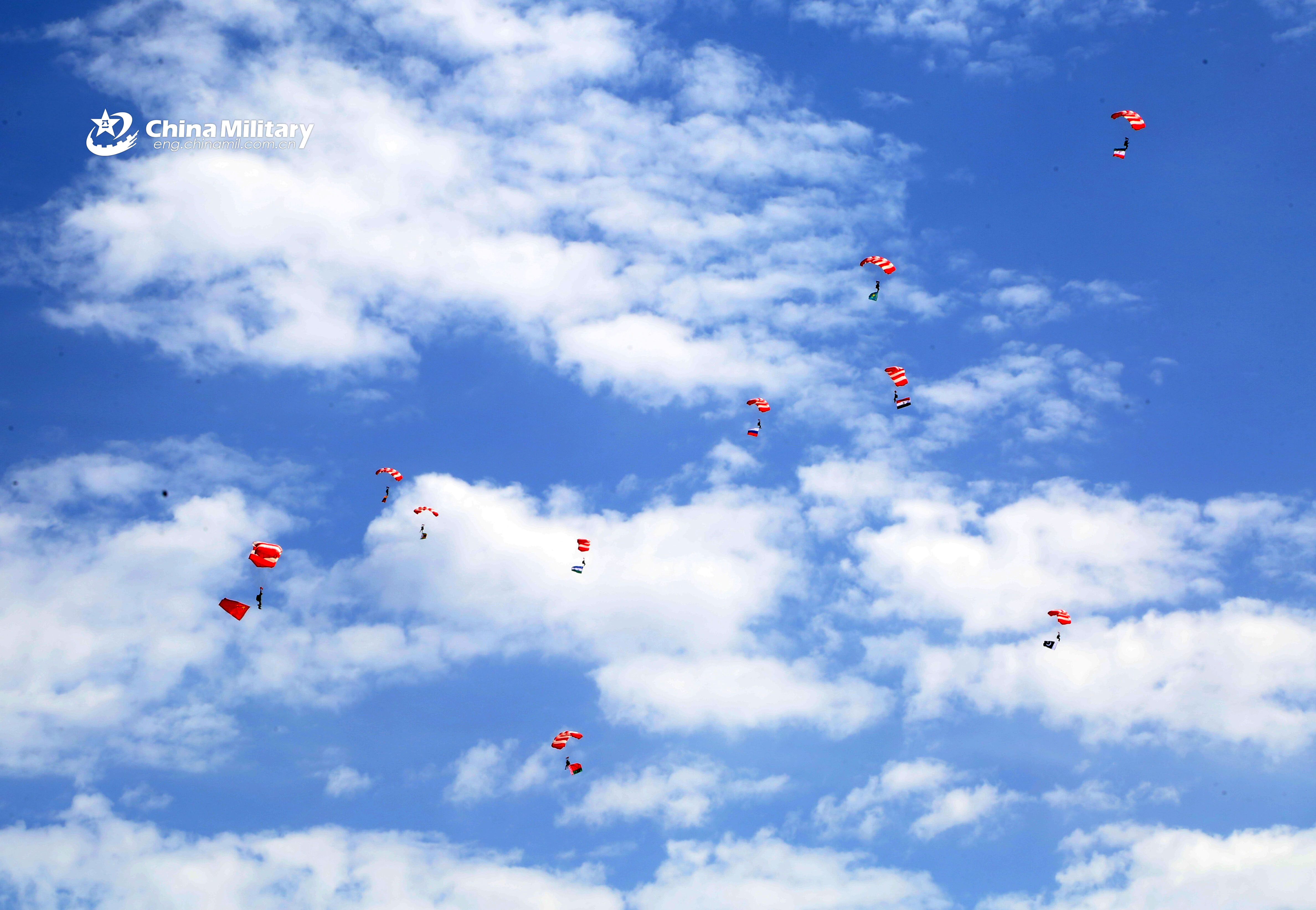 Paratroopers demonstrate parachute skills at the opening ceremony of the International Army Games 2018 in China. Three contests, namely the "Suvorov Attack," "Clear Sky" and "Safe Route" of the International Army Games (IAG) 2018 kicked off in northwest China's Xinjiang Uygur Autonomous Region on July 29, 2018. A total of 17 teams with 358 soldiers from 10 countries, including China, Belarus, Egypt, Kazakhstan, Russia, Venezuela and Zimbabwe, are participating the games that will conclude on Aug. 11, 2018. (eng.chinamil.com.cn/Photo by Luo Xingcang, Shu Gang and Cao Chenhe)