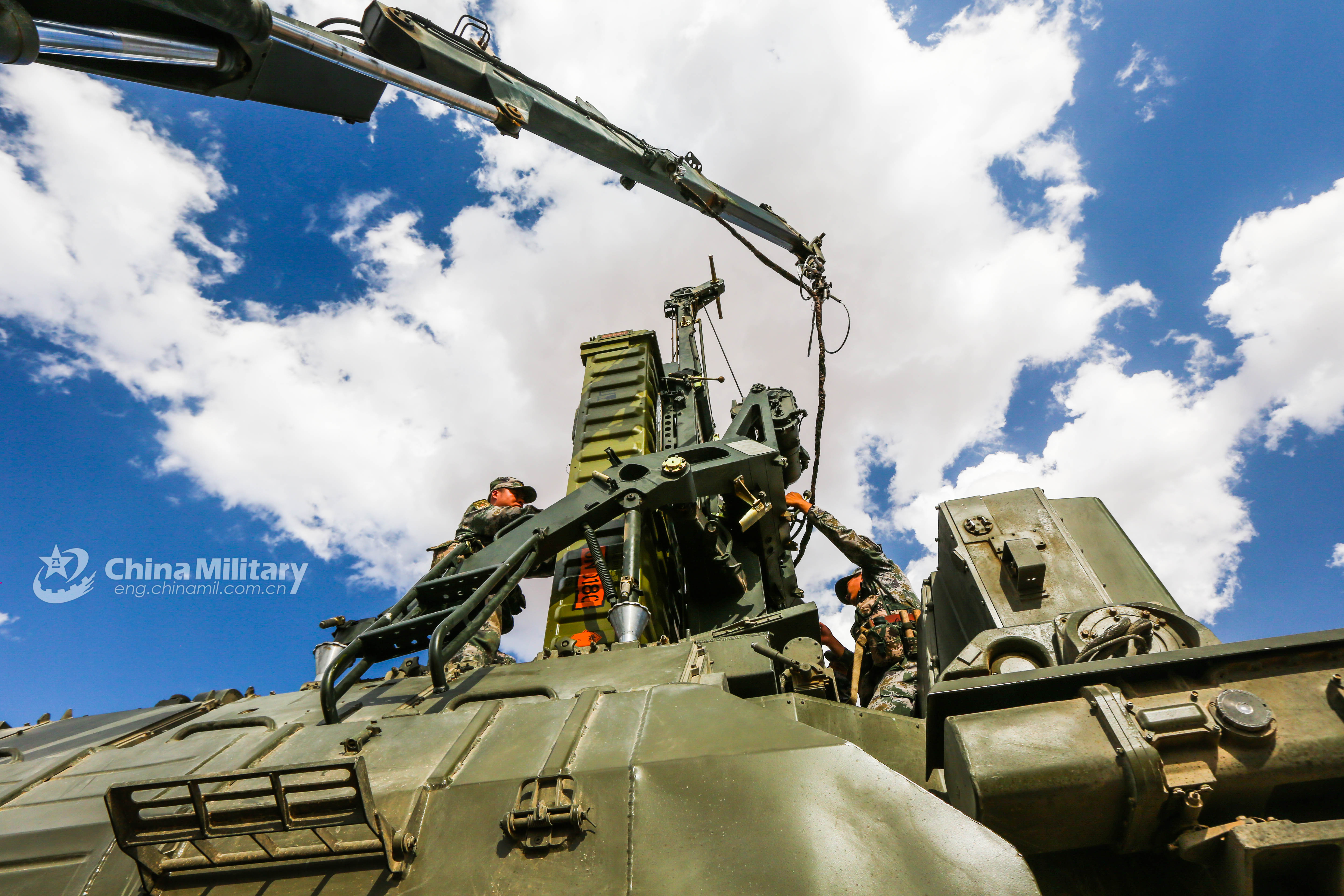 Soldiers assigned to an air-defense brigade under the PLA 72nd Group Army operate a crane to hoist and load missiles onto a Tor air-defense missile vehicle during recent training. (eng.chinamil.com.cn/Photo by Tong Zujing)