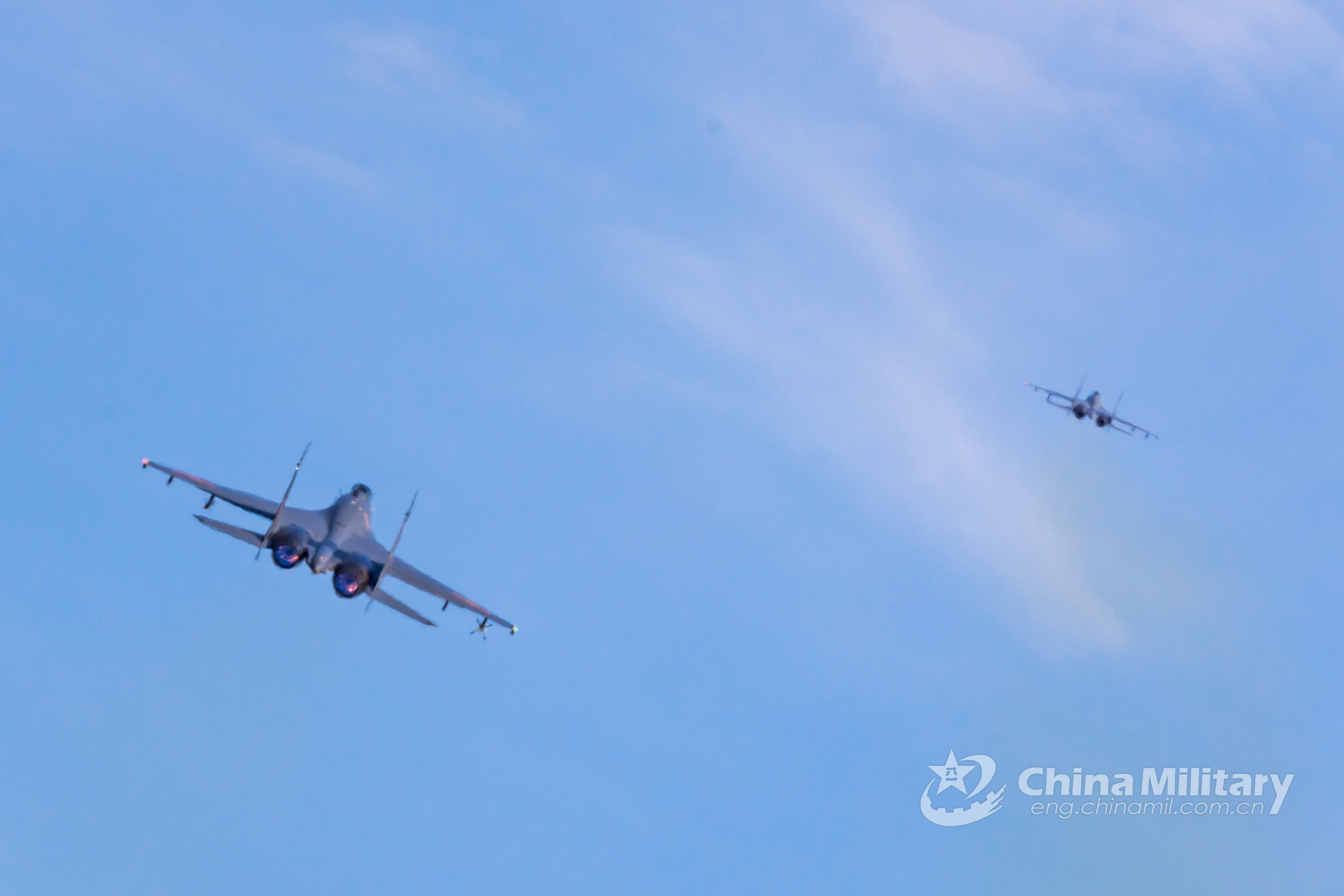 Two J-11 fighter jets attached to an aviation brigade of the air force under the PLA Northern Theater Command soar over the sky during a flight training exercise on Oct. 1, 2018. (eng.chinamil.com.cn/ Photo by Yang Pan)