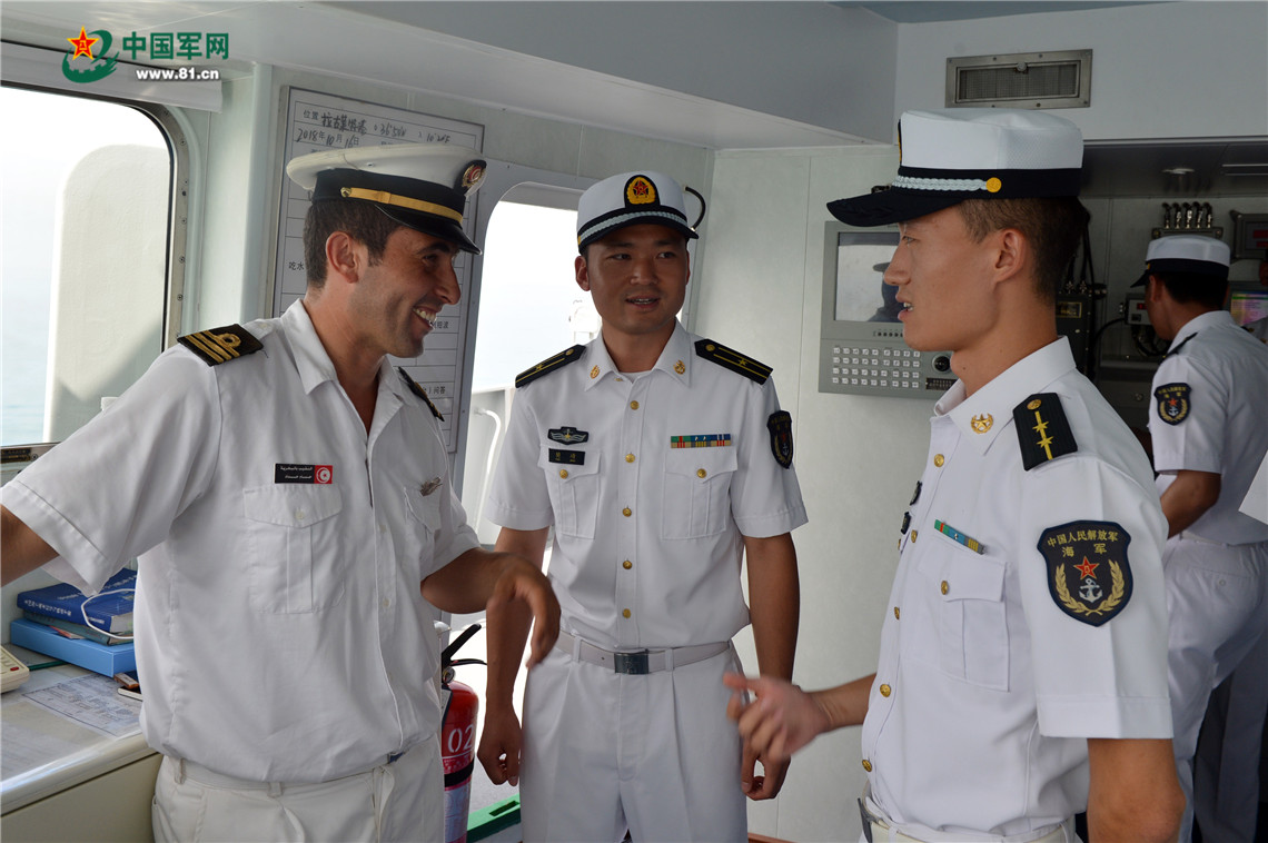 Chinese and Tunisian naval liaison officers talk with each other aboard the guided-missile frigate Wuhu. (81.cn/Photo by Zhang Hailong)