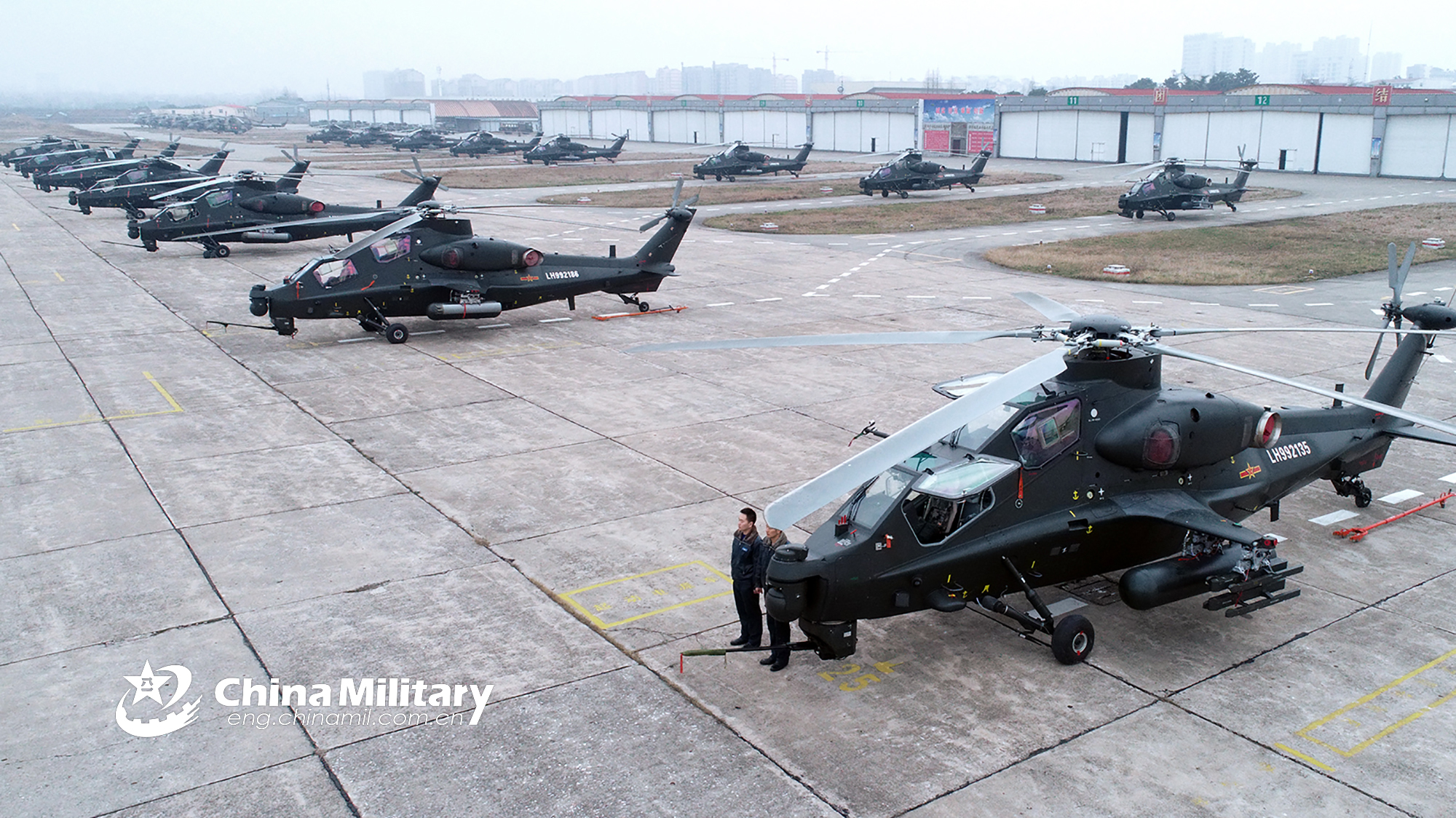 WZ-10 attack helicopters attached to an army aviation brigade under the PLA 72nd Group Army sit in front of aircraft hangars before takeoff during a flight training exercise on February 2, 2019. (eng.chinamil.com.cn/Photo by Zhang Huanpeng)