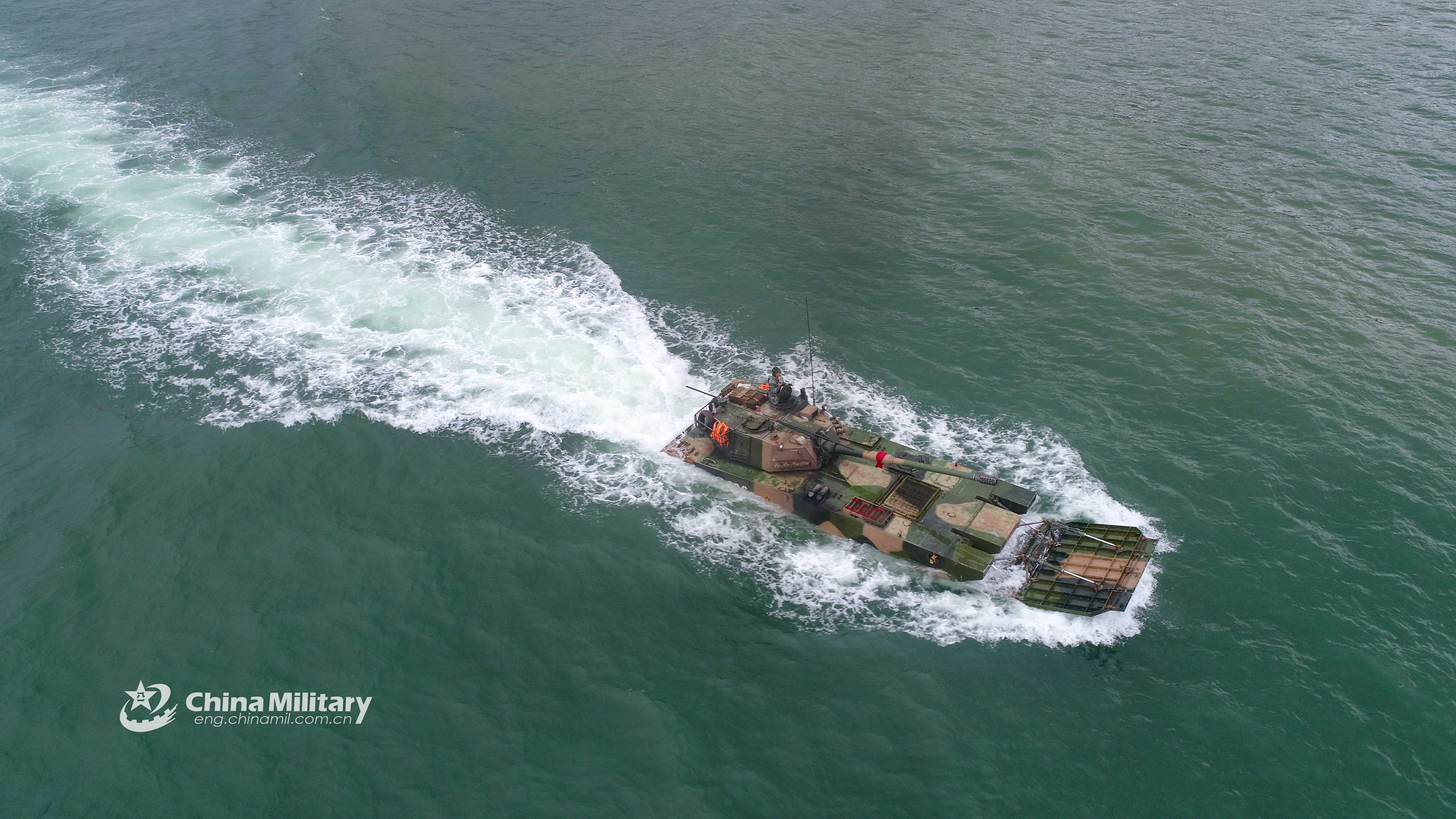An amphibious armored assault vehicle (AAAV) attached to an amphibious combined brigade with the PLA 73rd Group Army heads to shore during the live-fire maritime amphibious assault training in waters of the East China Sea on June 13, 2019. (eng.chinamil.com.cn/Photo by Zhang Teng)
