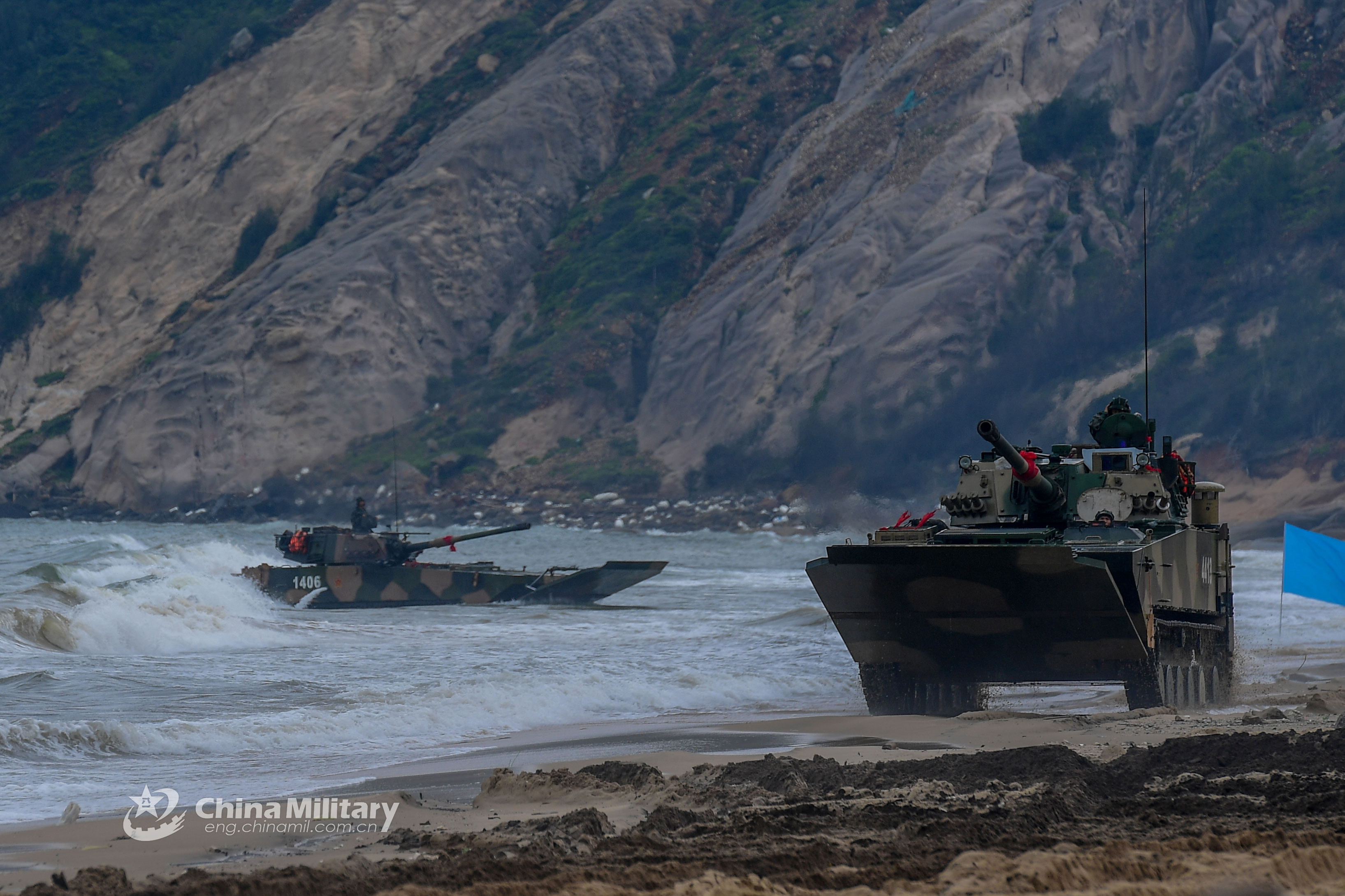 An amphibious armored assault vehicle (AAAV) attached to an amphibious combined brigade with the PLA 73rd Group Army moves forward on the beach during the live-fire maritime amphibious assault training in waters of the East China Sea on June 13, 2019. (eng.chinamil.com.cn/Photo by Zhang Teng)