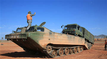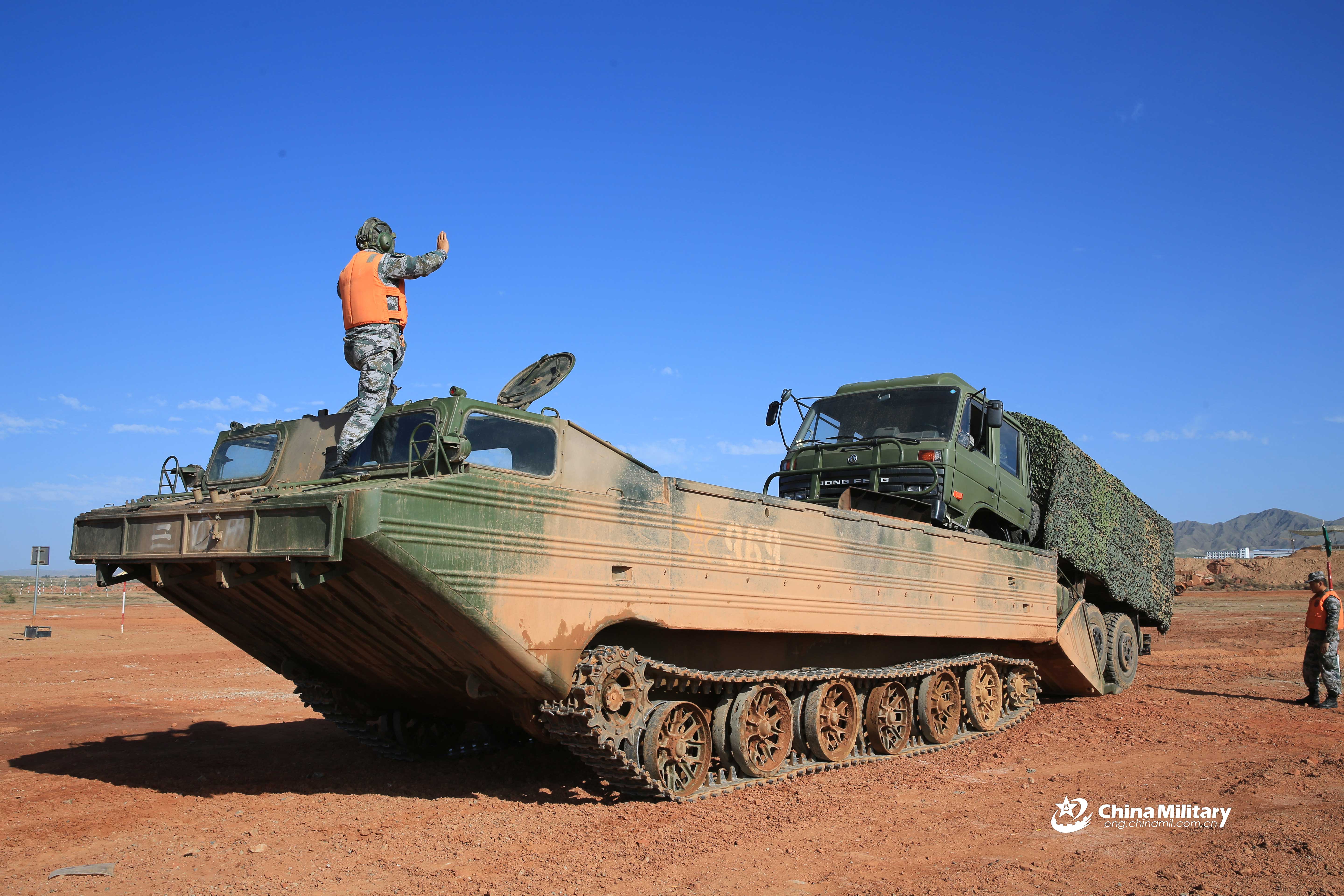 A soldier assigned to a brigade under the PLA 76th Group Army signals a military transport truck to unload from an amphibious armored carrier during the pre-competition preparation works for the “Engineering Formula” event of the upcoming International Army Games (IAG) 2019 on July 22, 2019. (eng.chinamil.com.cn/Photo by Gao Wanlu and Xi Haichun)