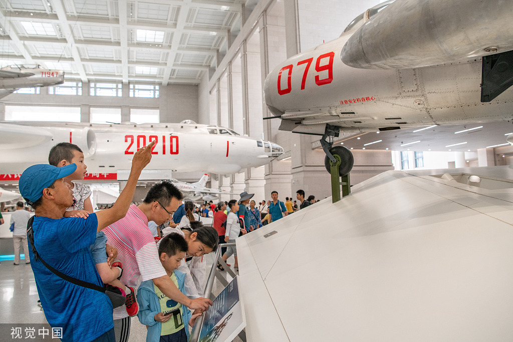 Visitors look in detail at a fighter jet on display at the Military Museum of the Chinese People's Revolution in Beijing, July 30, 2019. [Photo/VCG]