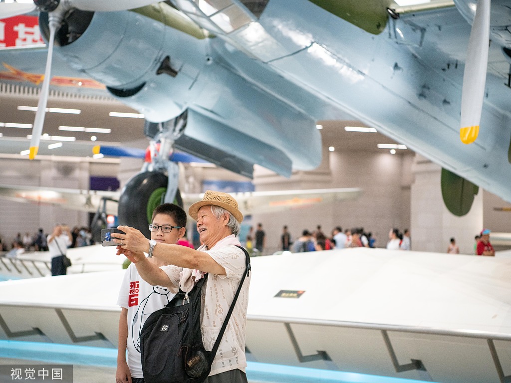 A man takes picture with his grandson in front of a plane on display at the Military Museum of the Chinese People's Revolution in Beijing, July 30, 2019. [Photo/VCG]