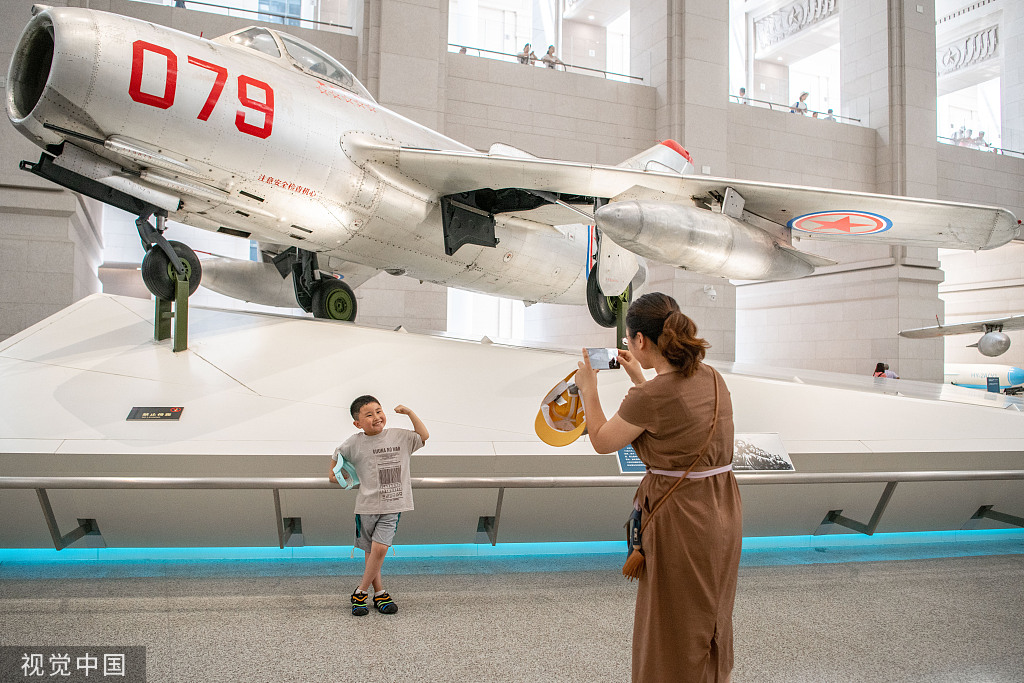 A woman takes photo of her son in front of a fighter jet on display at the Military Museum of the Chinese People's Revolution in Beijing, July 30, 2019. [Photo/VCG]