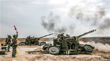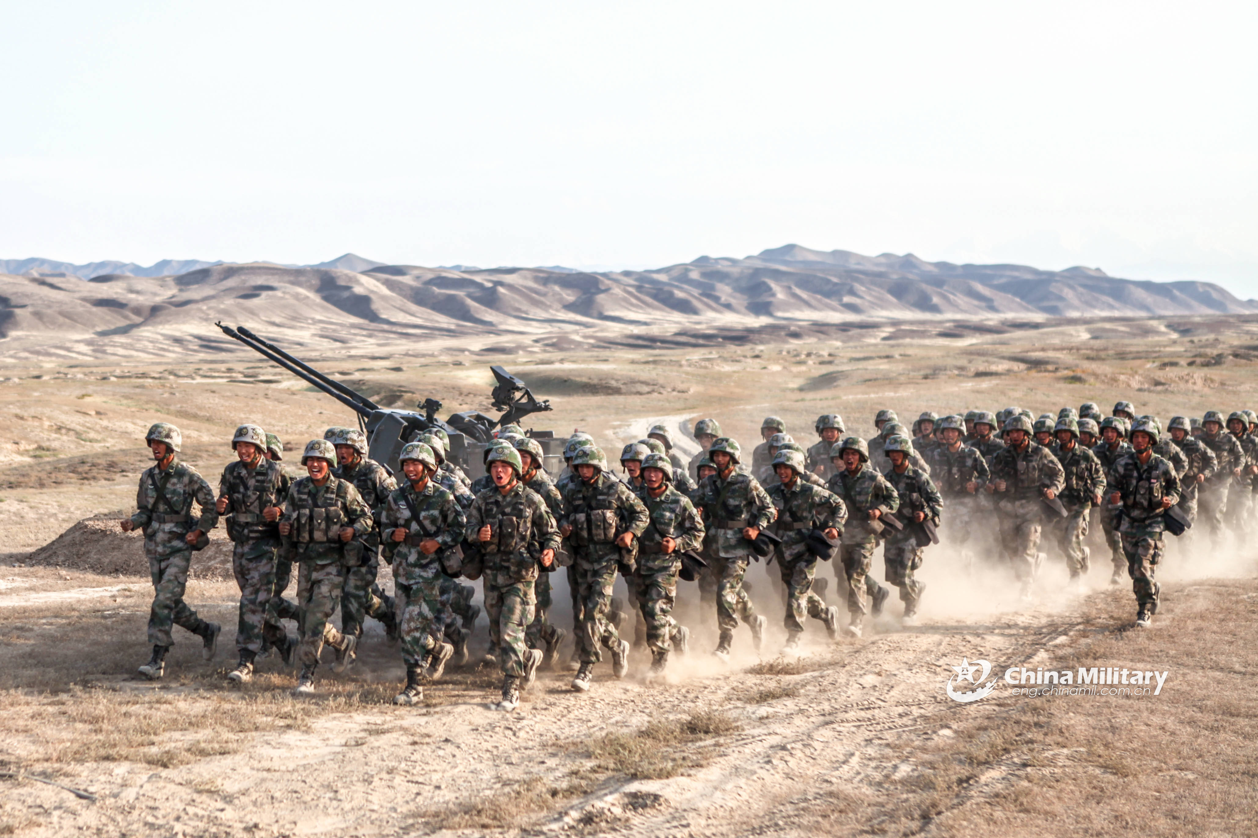 Soldiers assigned to an antiaircraft artillery regiment under the PLA Xinjiang Military Command run towards a new position during a live-fire training exercise in the Tian mountain area of northwest China's Xinjiang Uygur Autonomous Region in mid-July. The exercise focuses on subjects including quick maneuver, position occupation, air intelligence early warning, command and control, and fire strike. (eng.chinamil.com.cn/Photo by Zhang Zhongchou and Xu Tianyang).