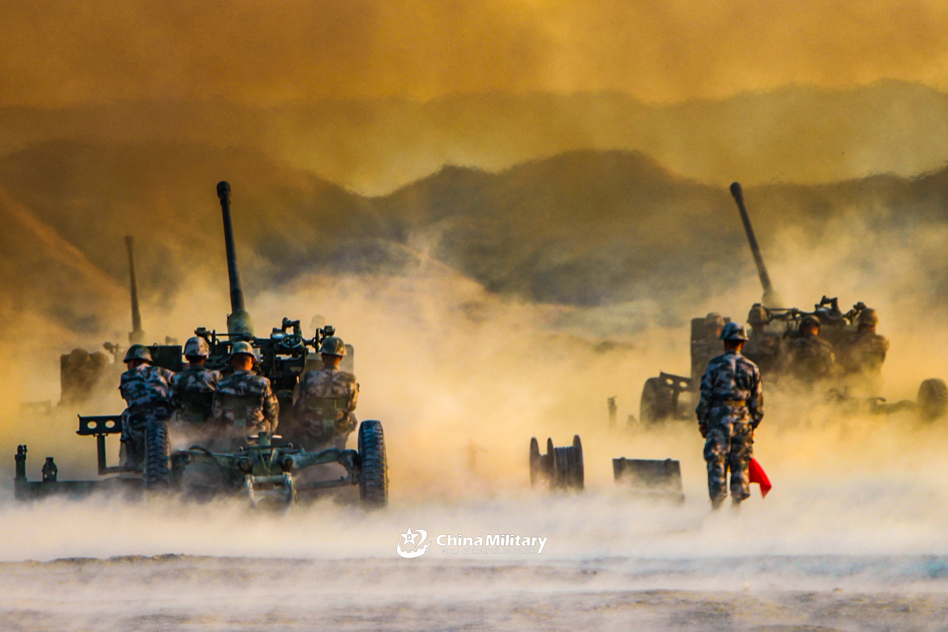 Soldiers assigned to an antiaircraft artillery regiment under the PLA Xinjiang Military Command fire anti-aircraft guns during a live-fire training exercise in the Tian mountain area of northwest China's Xinjiang Uygur Autonomous Region in mid-July. The exercise focuses on subjects including quick maneuver, position occupation, air intelligence early warning, command and control, and fire strike. (eng.chinamil.com.cn/Photo by Zhang Zhongchou and Xu Tianyang)