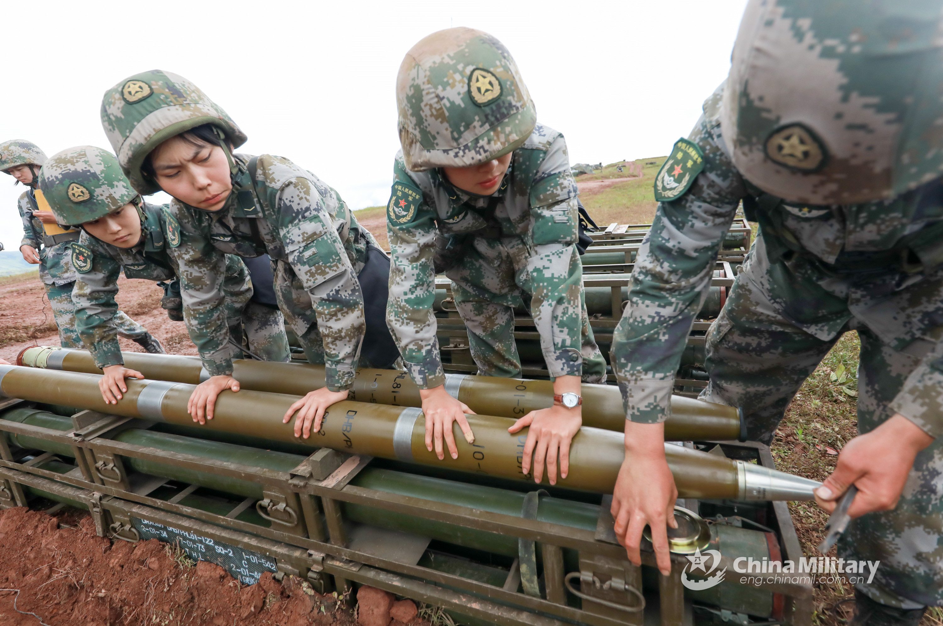 Artillery women assigned to a female platoon of an artillery brigade under the PLA 77th Group Army prepare missiles for a live-fire test on August 3, 2019. (eng.chinamil.com.cn/Photo by Hu Jing and Sun Zhenqi)