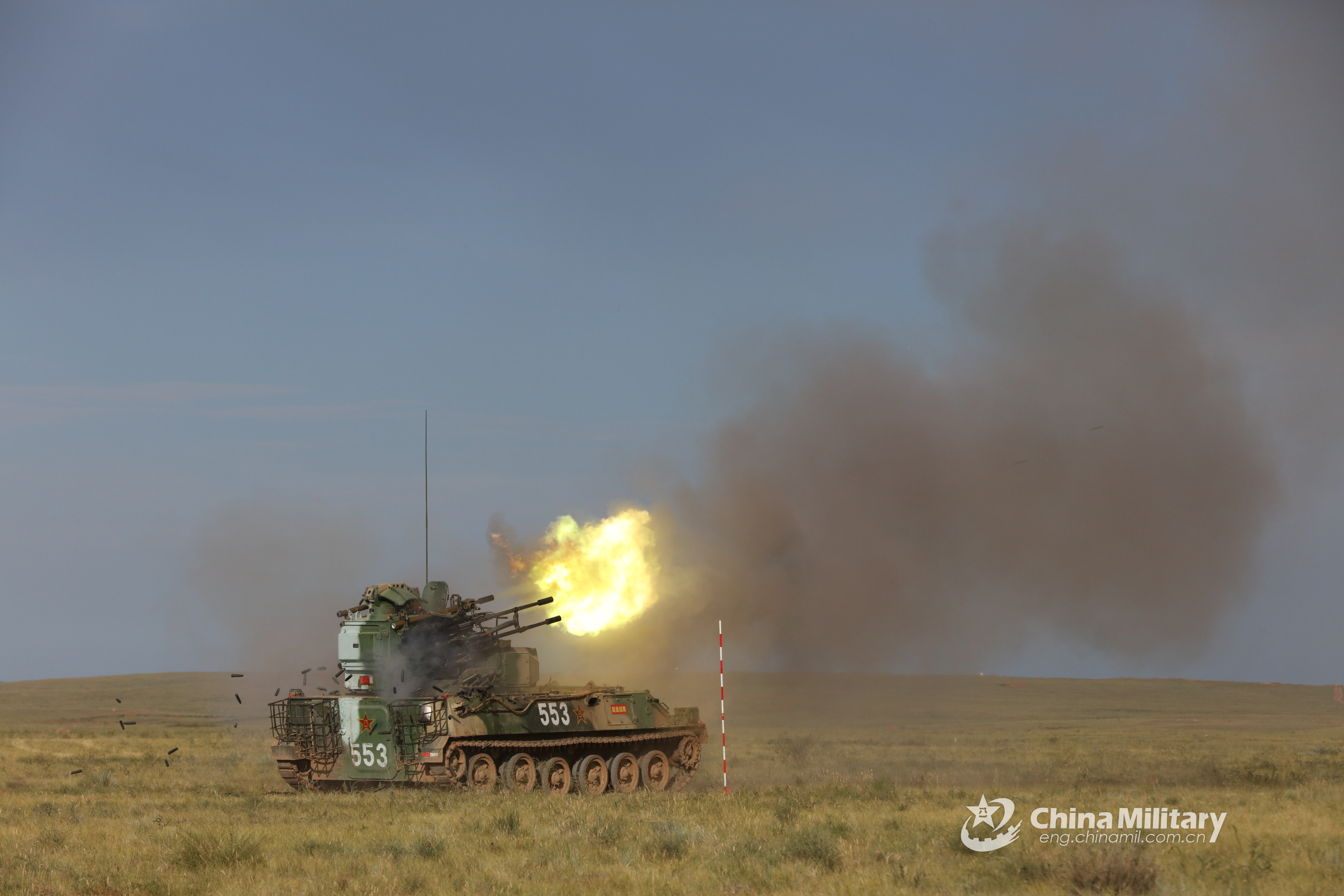 An anti-aircraft gun attached to a combined brigade under the PLA 79th Group Army fires at mock aerial targets during a coordinated combat training exercise in Jiuquan, northwest China’s Gansu Province lately. (eng.chinamil.com/cn/Photo by Ye Honglin, Wang Tianfa, Zhang Tianli and Gao Shengyu)